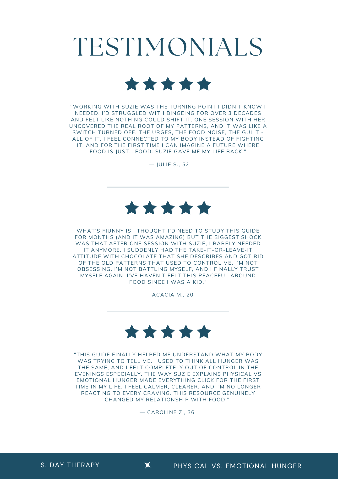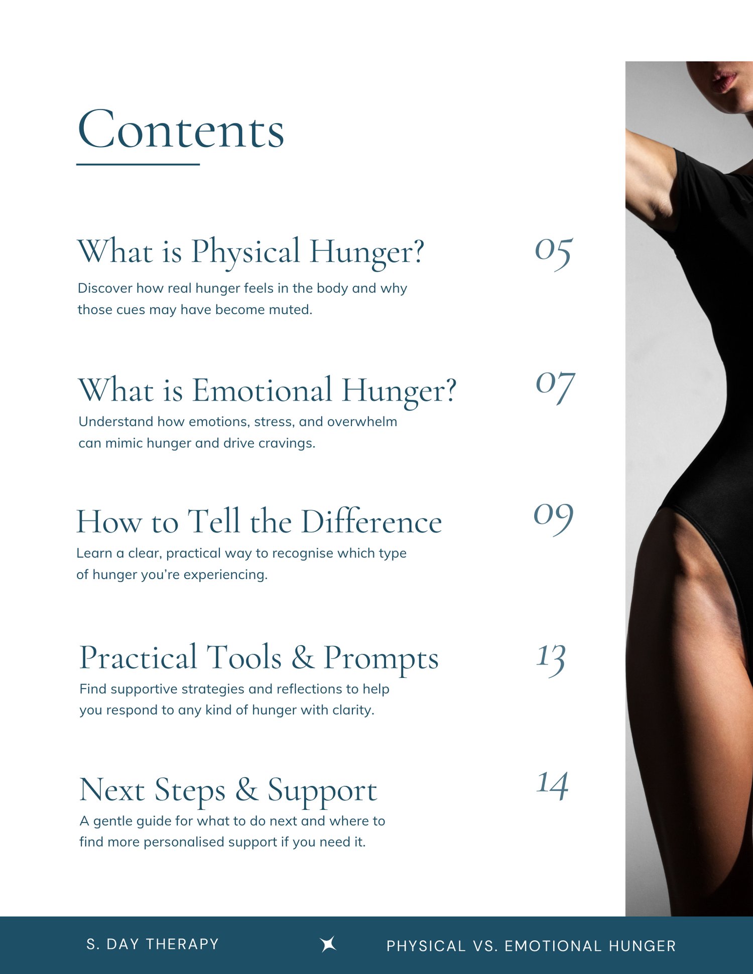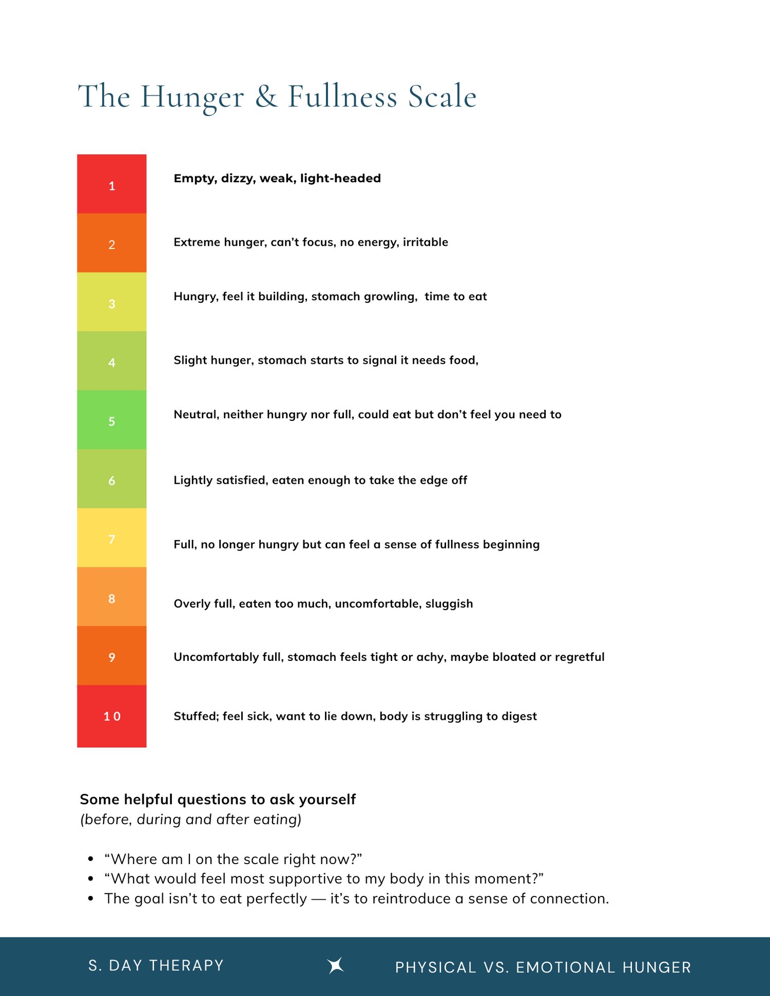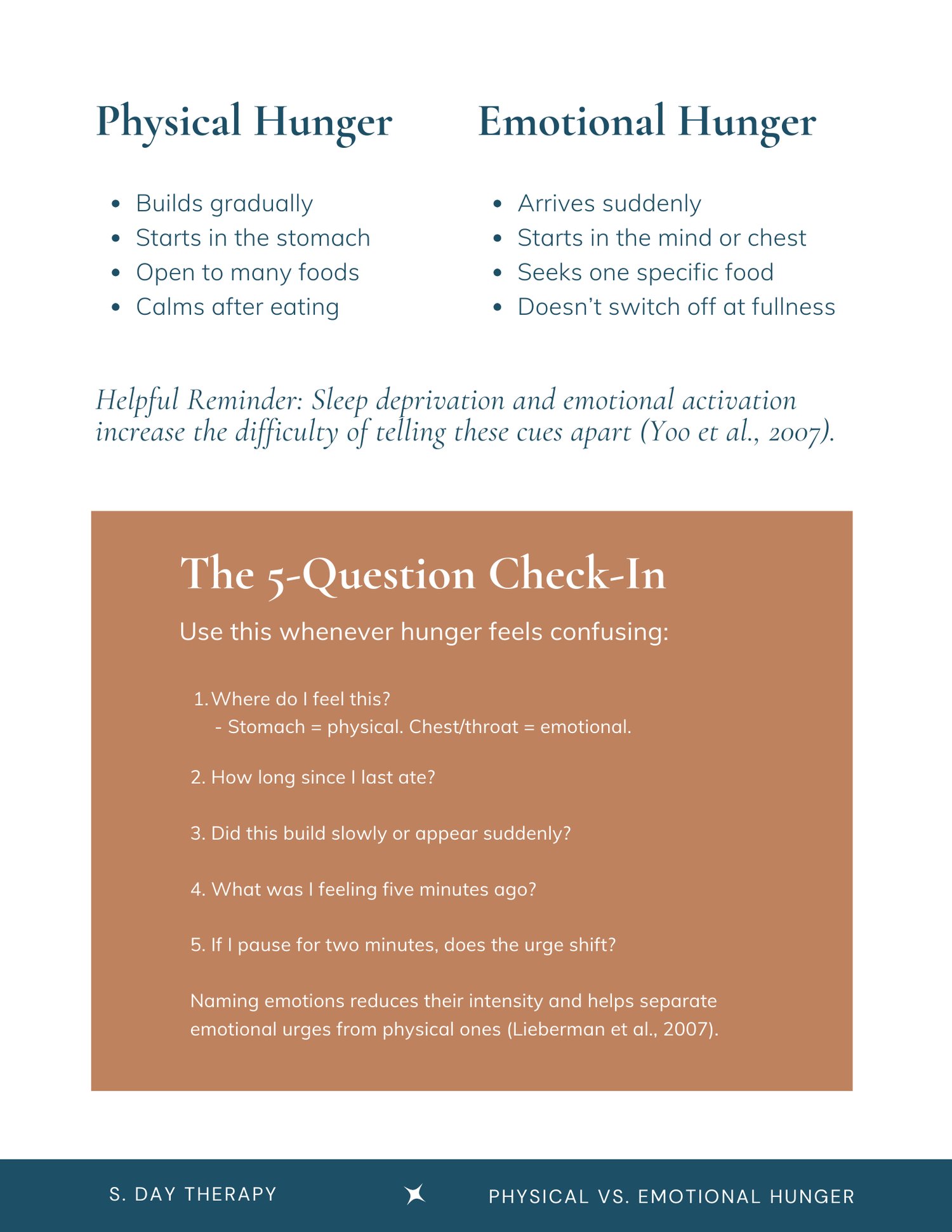- Clear explanations of physical hunger vs emotional hunger