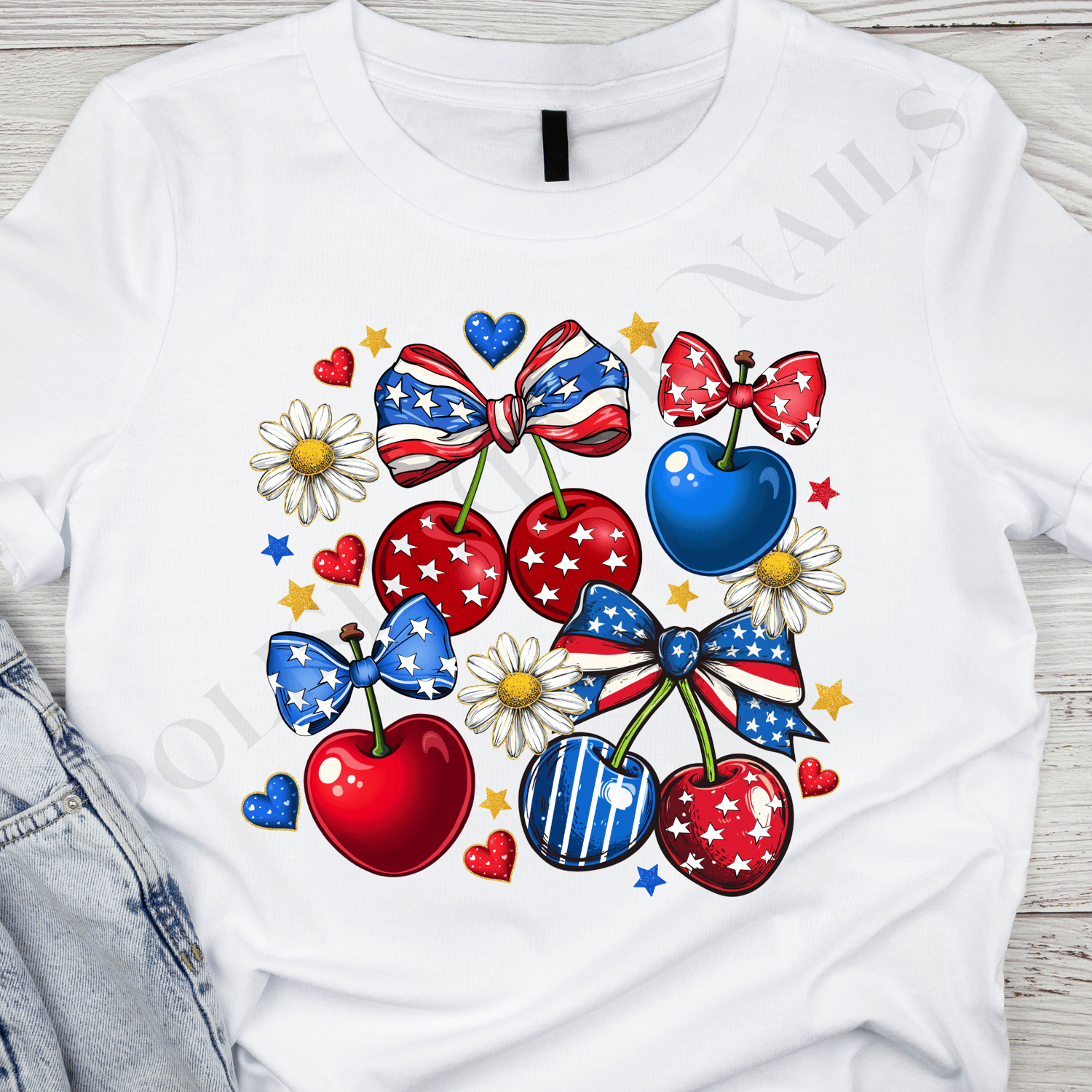Show your patriotic spirit with this festive 'USA Cherries & Bows' t-shirt! This fun design features red, white, and blue cherries and bows adorned with stars and stripes, alongside scattered hearts and stars. It's a cheerful and vibrant way to celebrate.