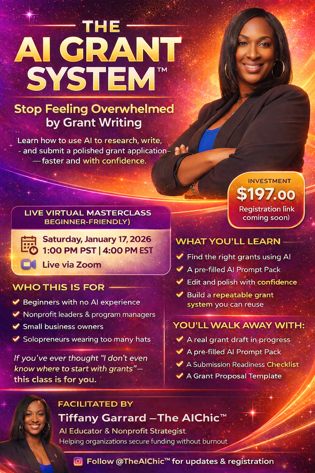 The AI Grant System™ is a live, 2.5-hour beginner-friendly Zoom masterclass designed for nonprofit leaders, small business owners, solopreneurs, and program managers who want a clear, repeatable way to research, write, and submit grant applications using AI.