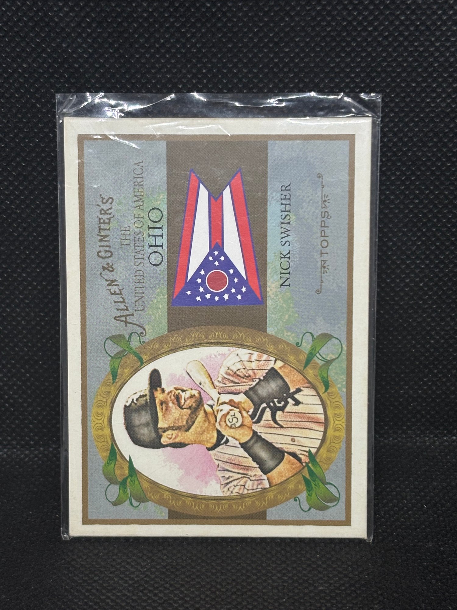 A vintage-style Allen & Ginter mini insert celebrating Nick Swisher and his roots in the State of Ohio. This limited subset from the 2009 Allen & Ginter release combines classic 19th-century artwork with modern baseball stars, featuring ornate borders, soft color tones, and the iconic Ohio state flag in the background.