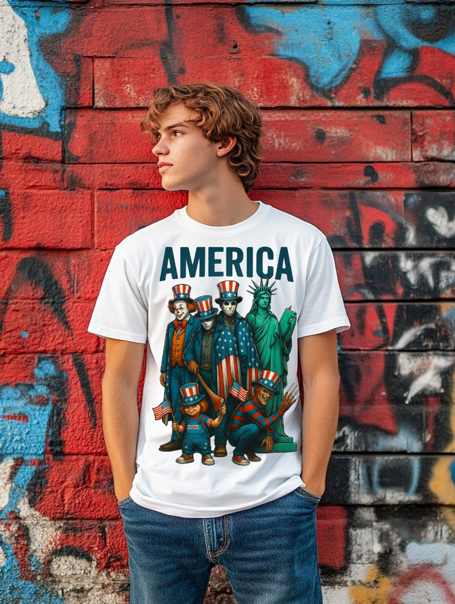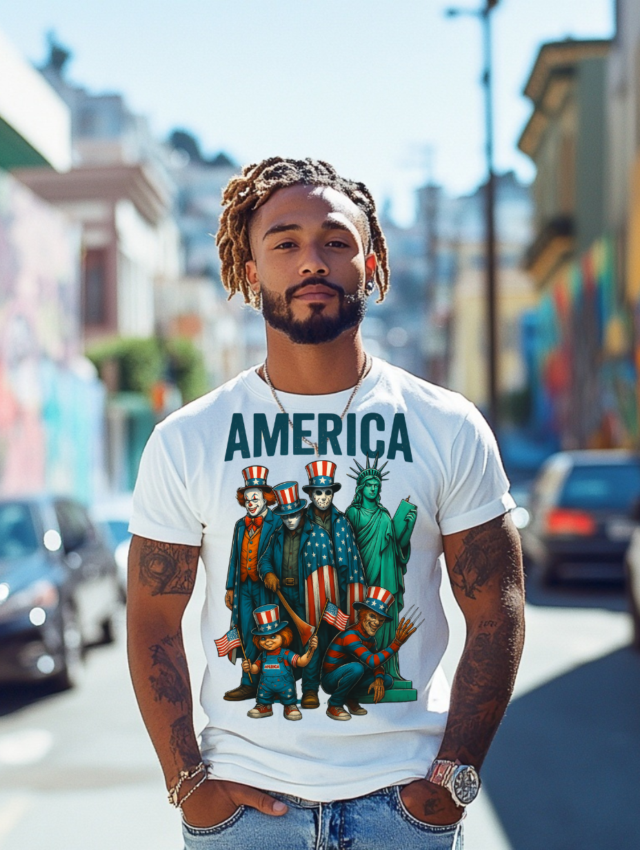 Make a bold and creative statement with this unique America-themed digital design featuring a powerful lineup of patriotic characters! Perfect for July 4th, Memorial Day, Veterans Day, or anytime you want to celebrate the red, white, and blue with attitude.