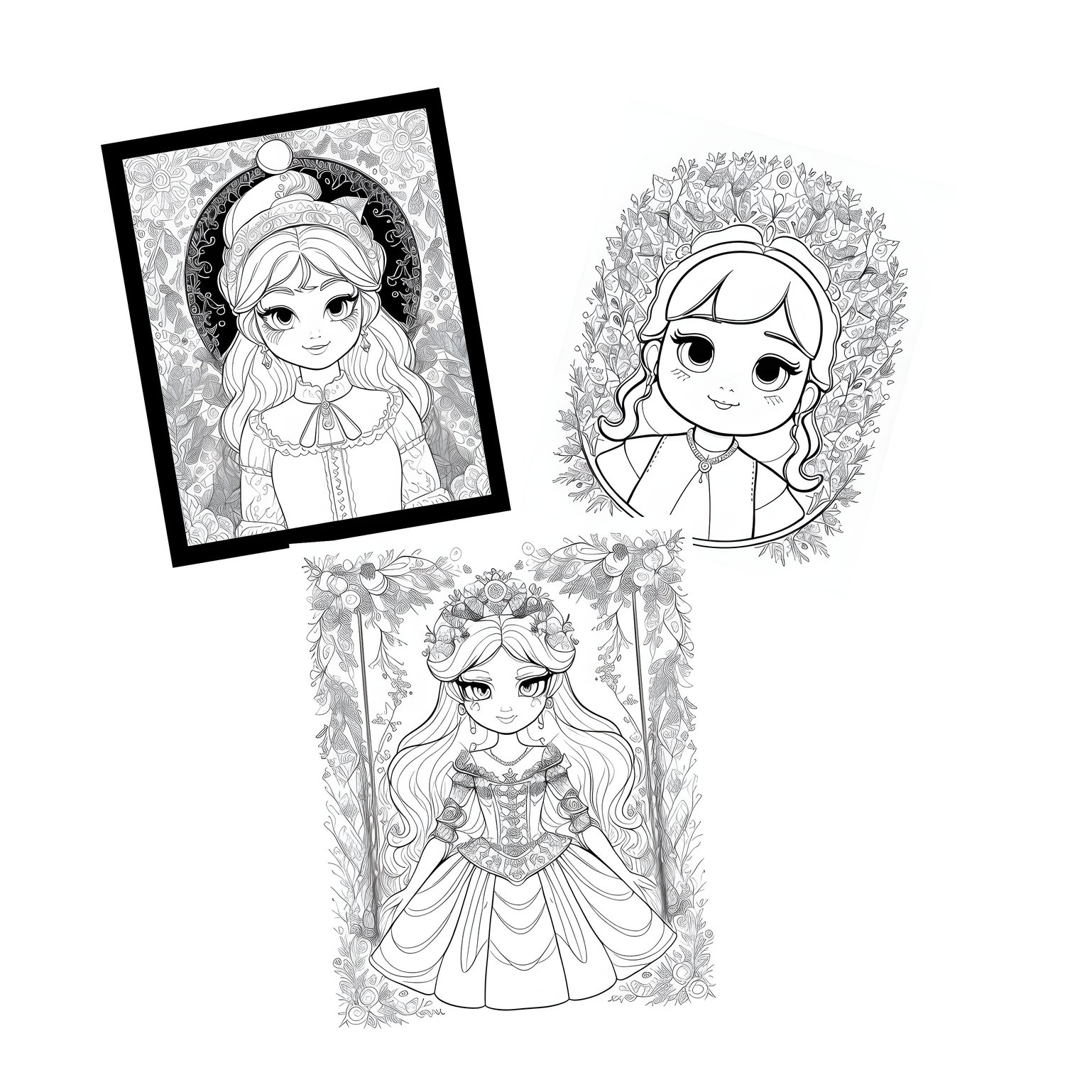 This collection features three exquisitely detailed princess-themed coloring pages. Each illustration showcases a unique princess character surrounded by intricate floral and nature-inspired designs. The black and white line art offers a perfect canvas for colorists to express their creativity, whether using digital tools or traditional coloring methods. Ideal for both children and adults, these pages provide a delightful escape into a world of fantasy and magic.