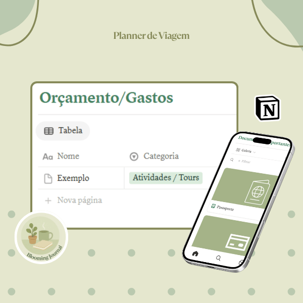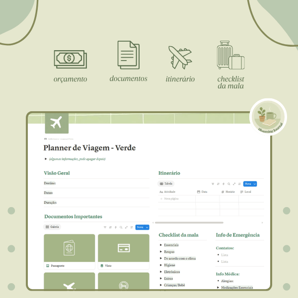 Este template reúne as principais informações de uma viagem em um único espaço dentro do Notion, ajudando a acompanhar planejamento, documentos e detalhes importantes antes e durante a viagem!