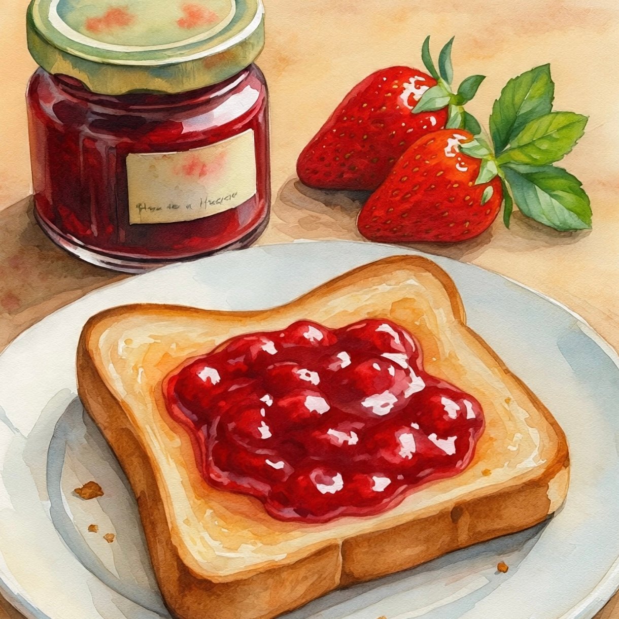 A cozy breakfast scene featuring golden toast with rich strawberry jam, capturing the warmth of a simple morning. The shiny red jam and ripe strawberries give a fresh and comforting feeling. It’s a reminder of homemade goodness and peaceful mornings.
