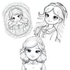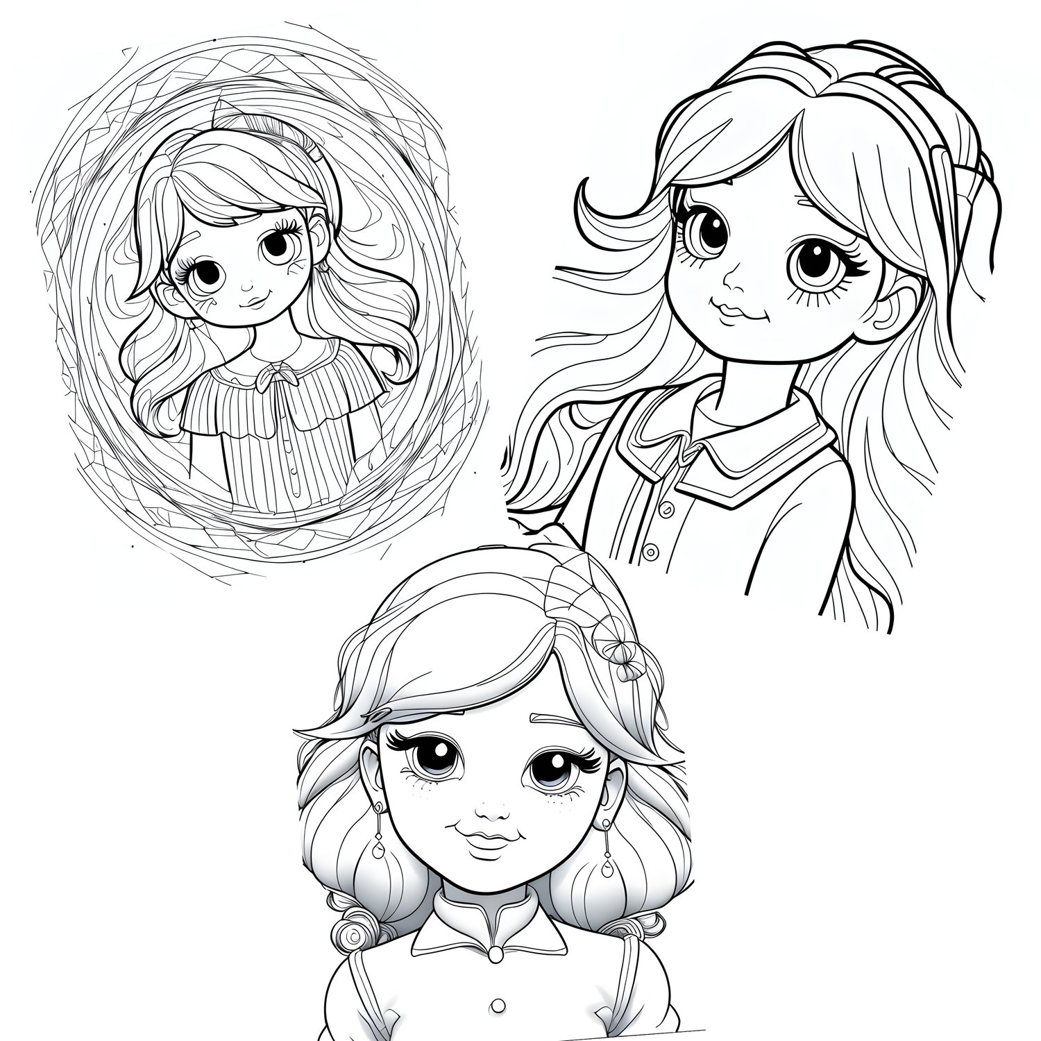 A collection of three charming digital illustrations featuring young girls with large, expressive eyes and flowing hair. Each portrait is drawn in a whimsical, coloring book style, perfect for children's books, coloring pages, or decorative art prints. The set showcases diverse hairstyles and outfits, capturing the essence of youthful innocence and imagination.