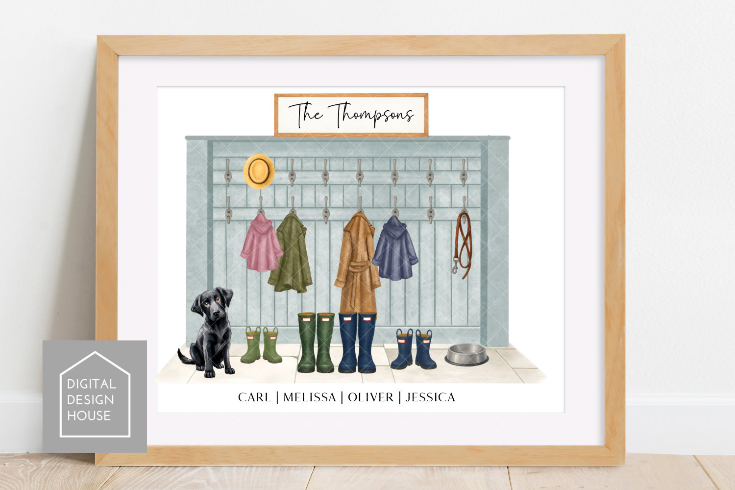 This listing is for a BOOT ROOM Builder. You get a Boot Room in 4 different colours, Sage, Cream, Blue & Grey. You also get a selection of Country Style Coats for Adults and some for Children as well as hats and some hook extras such as a dog lead, umbrellas and a bag. You also get a wooden farmhouse frame which is a perfect way to add a personal touch to the design by using it to add a name and is perfect for making your own country style inspired family prints.