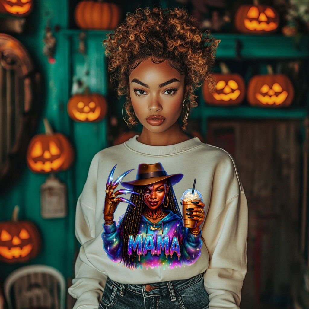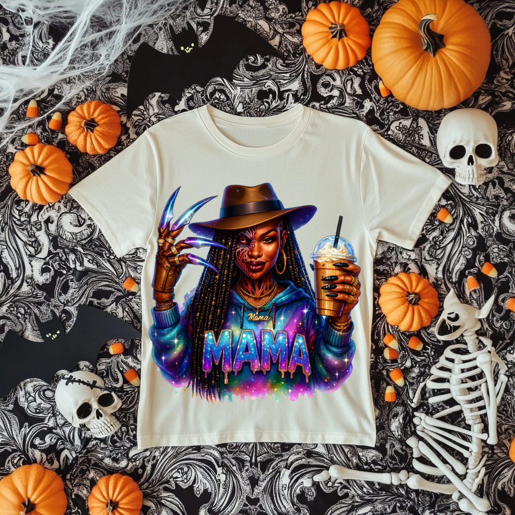 Give spooky season some sass! This fierce Freddy-inspired “MAMA” design is everything—long locs, claw glove, glowing hoodie, and iced coffee in hand. A bold, vibrant, and chillingly cute tribute to mamas who run the show (even in their nightmares 😏).