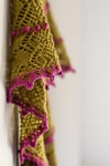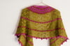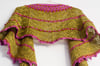 This is a top down crescent shaped wrap with some fun textures. The lovely lace pattern is an easy repetition of stitches and makes up the body of the shawl with some garter rows, nupps and bobbles thrown in for good measure.