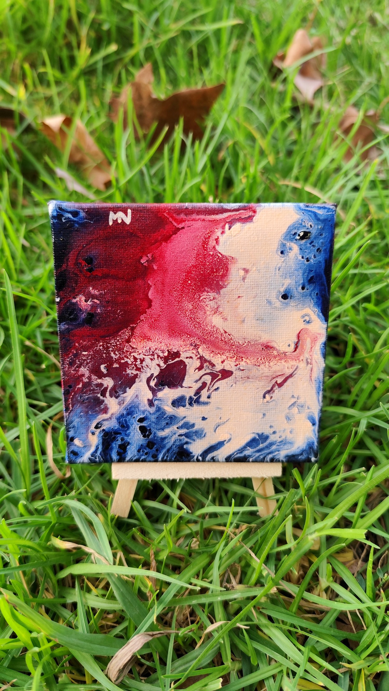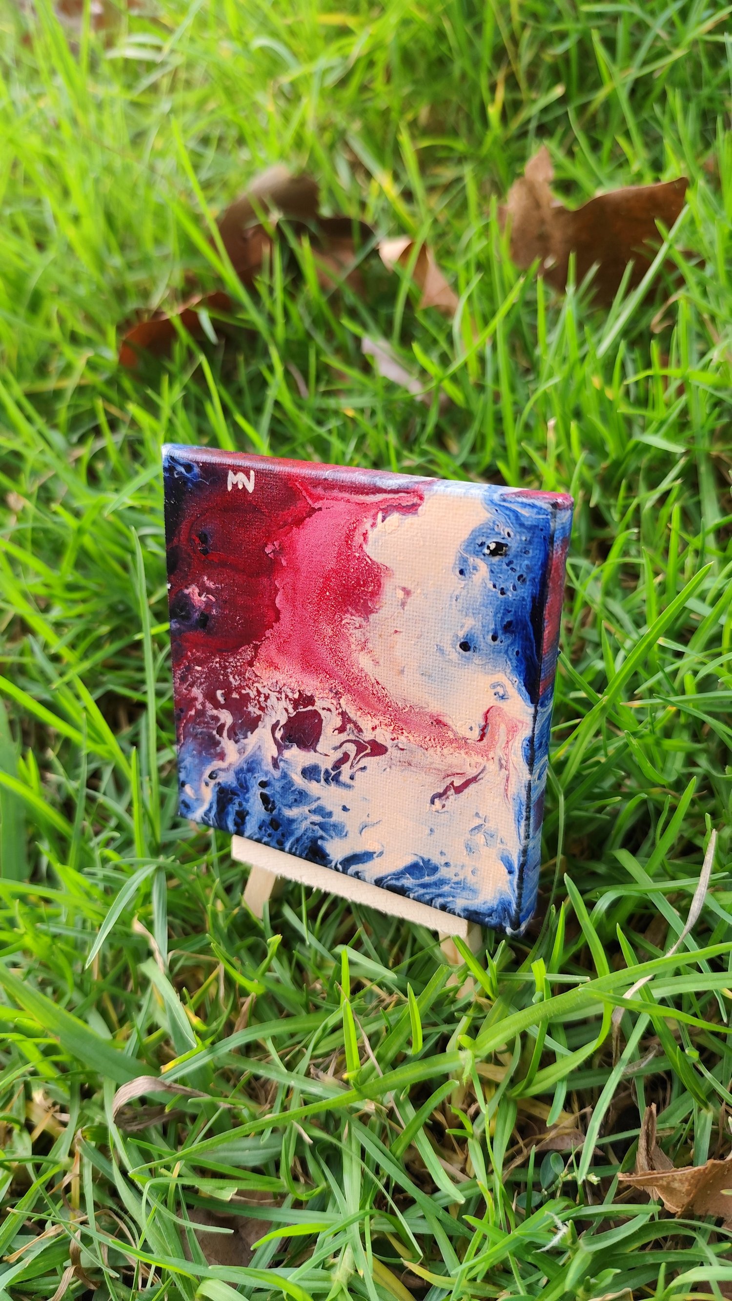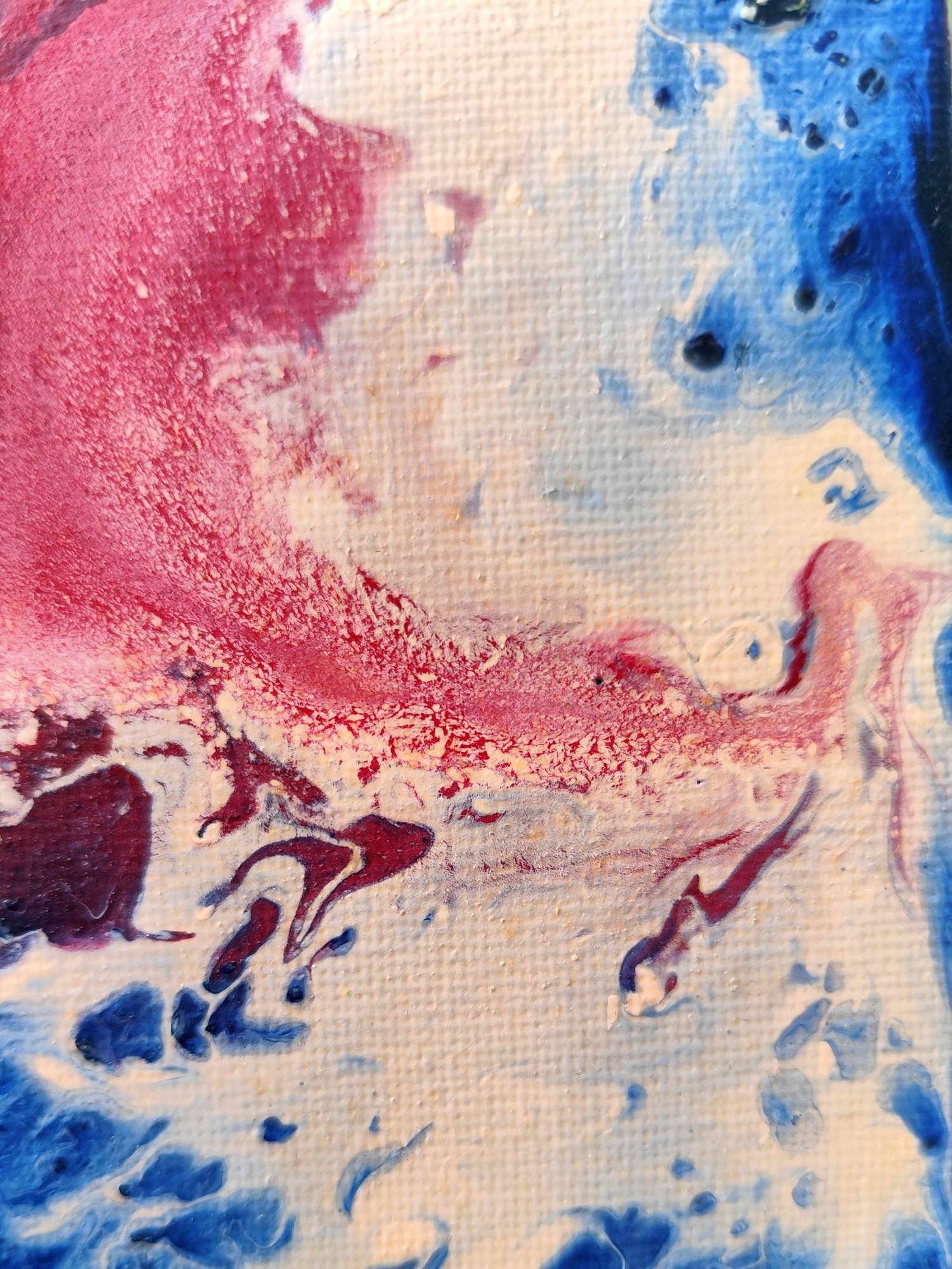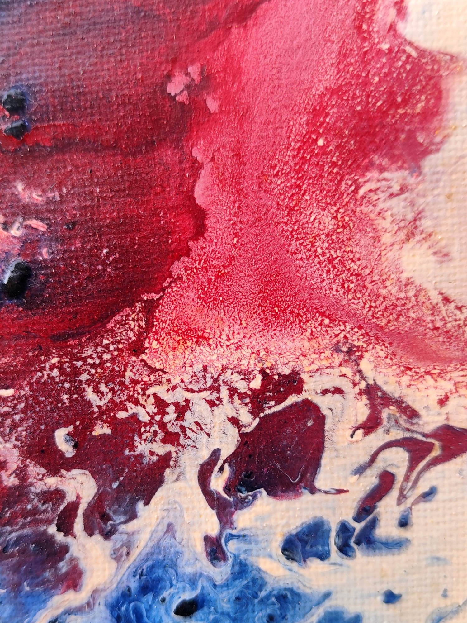 “Transmutación” es un lienzo que nace del encuentro entre el rojo y el azul: dos colores que se entrelazan, se transforman y crean un nuevo equilibrio entre energía y calma.