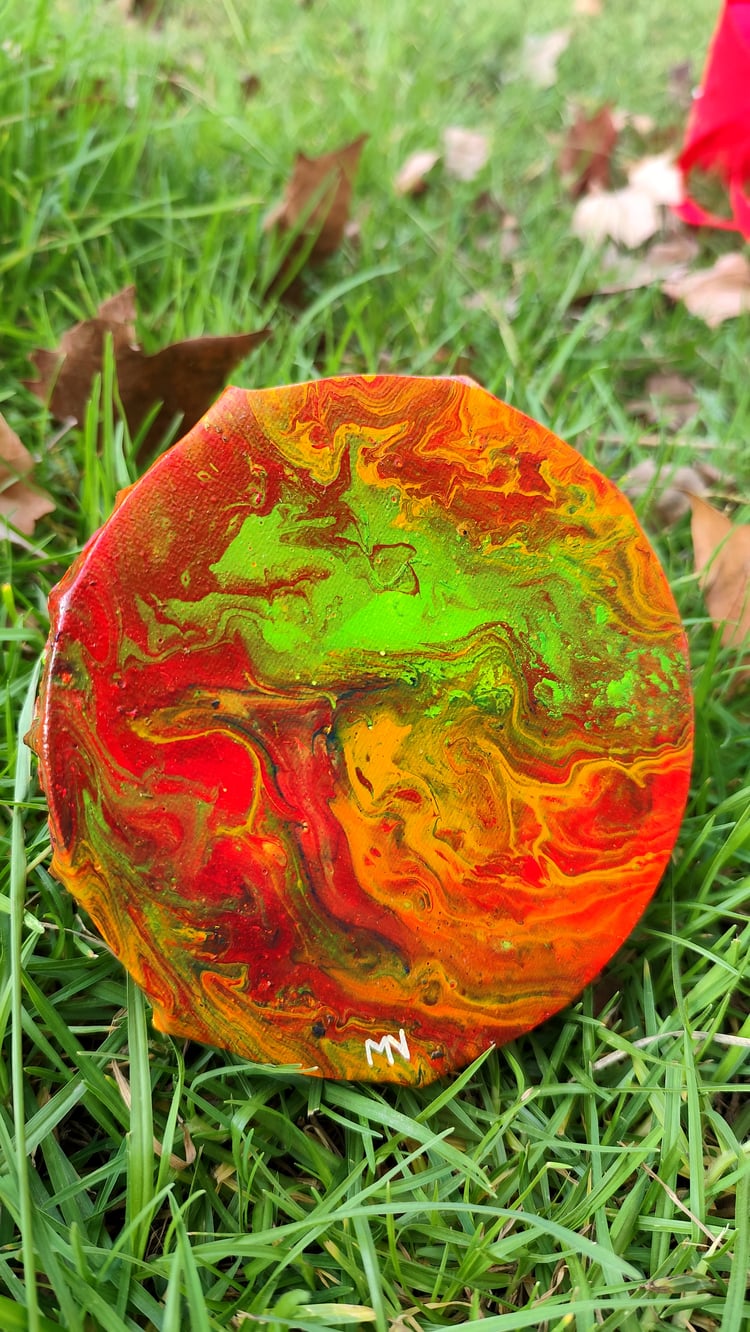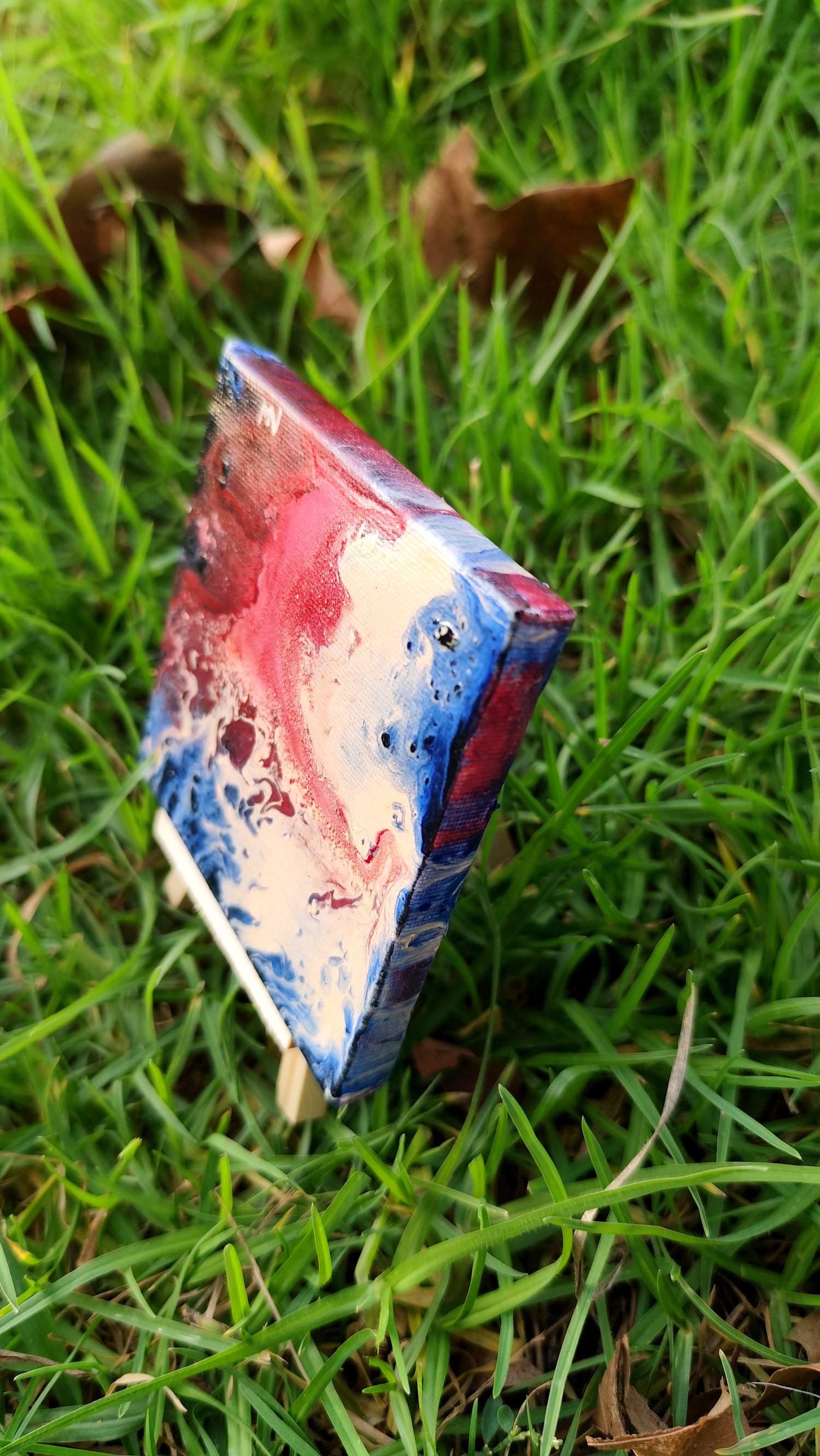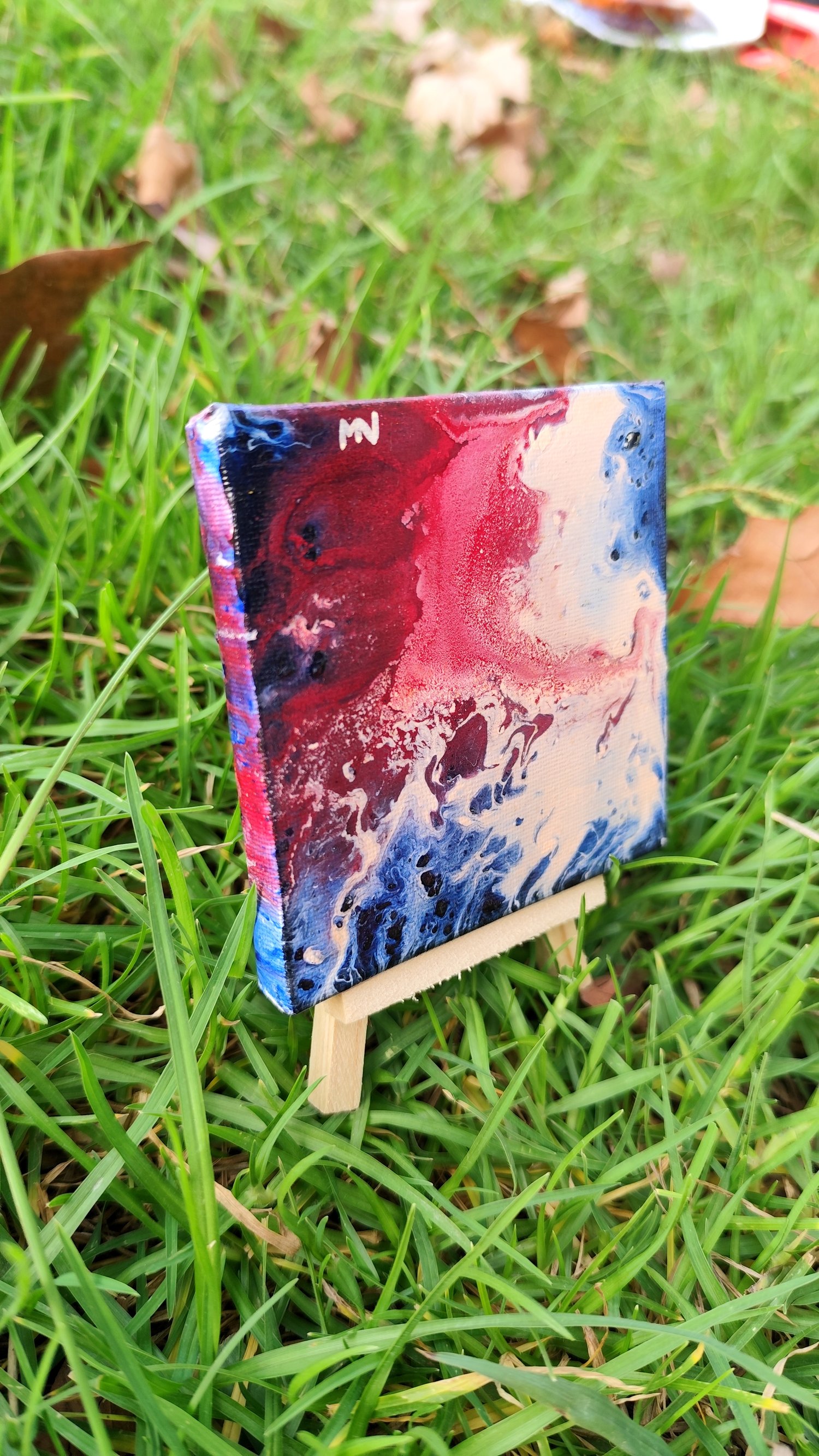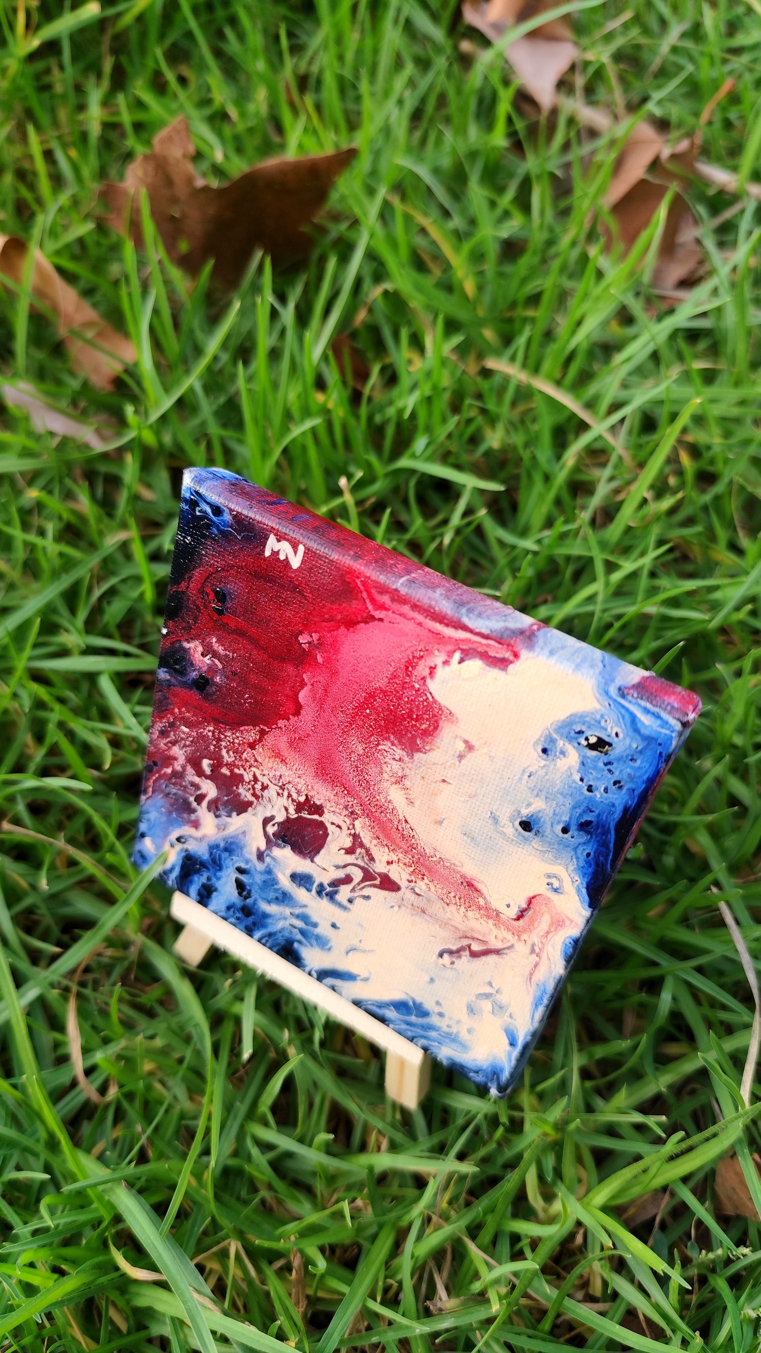 “Transmutación” es un lienzo que nace del encuentro entre el rojo y el azul: dos colores que se entrelazan, se transforman y crean un nuevo equilibrio entre energía y calma.