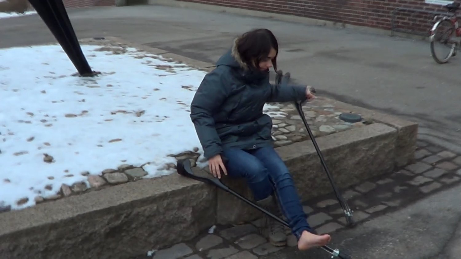 This clips starts with Elisabeth rips her pantyhose from her sprained ankle.Since it´s cold outside and she has heard that you should ice a sprained ankle she thinks this is a good idea.She start crutch but soon sits down since her foot start to hurt.After the break she must crutch down a stair and then she puts her crutches away and start hopping on one leg to a bench