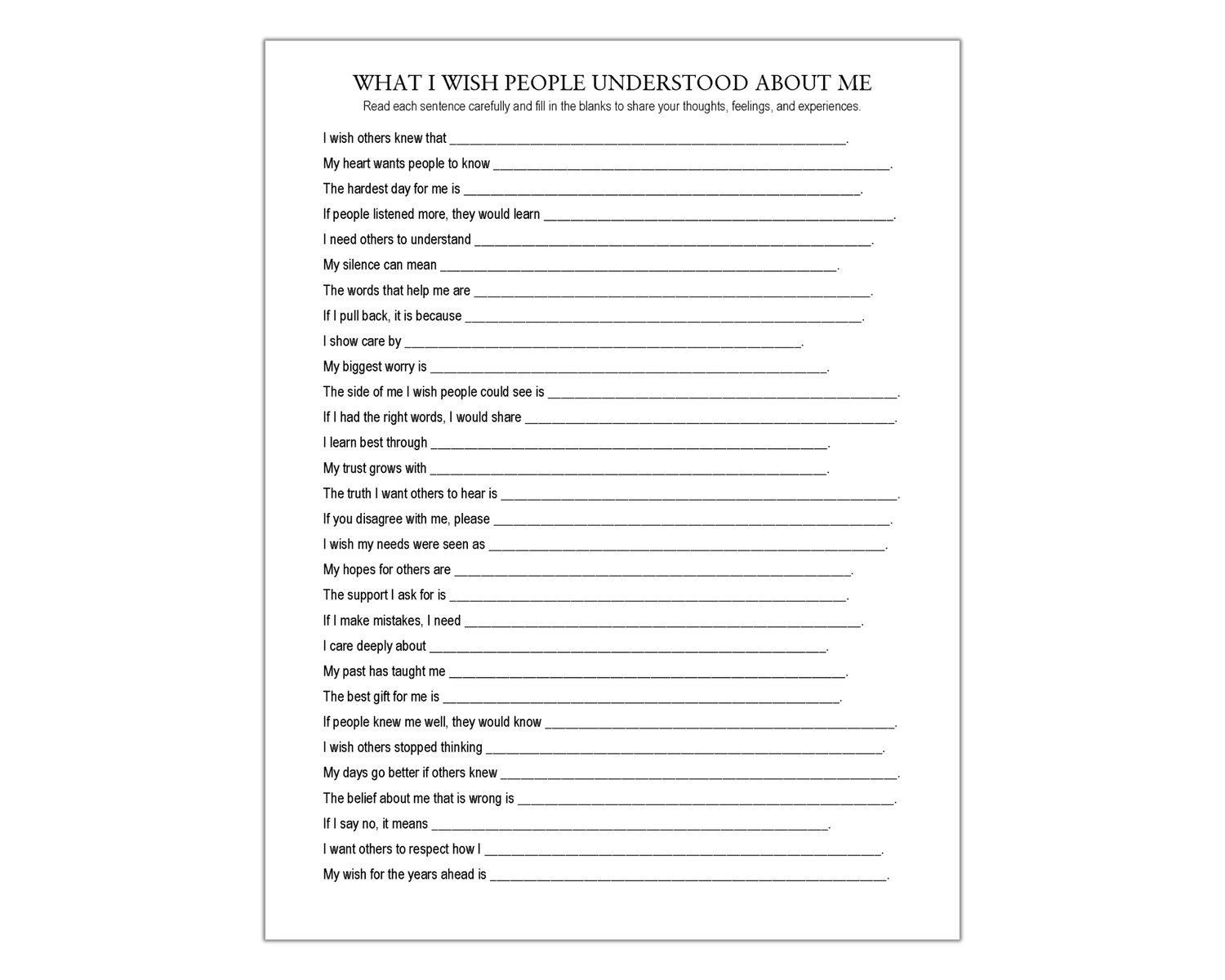 Telling people what you need is a skill that takes practice. This What I Wish People Understood About Me worksheet features 30 prompts to help you find the right words to explain your inner world to friends, family, or even a partner. Use it for therapy sessions, journaling, or self-reflection to bridge the gap between how you feel and what others perceive. When you share your "why," you invite people to love the real version of you.