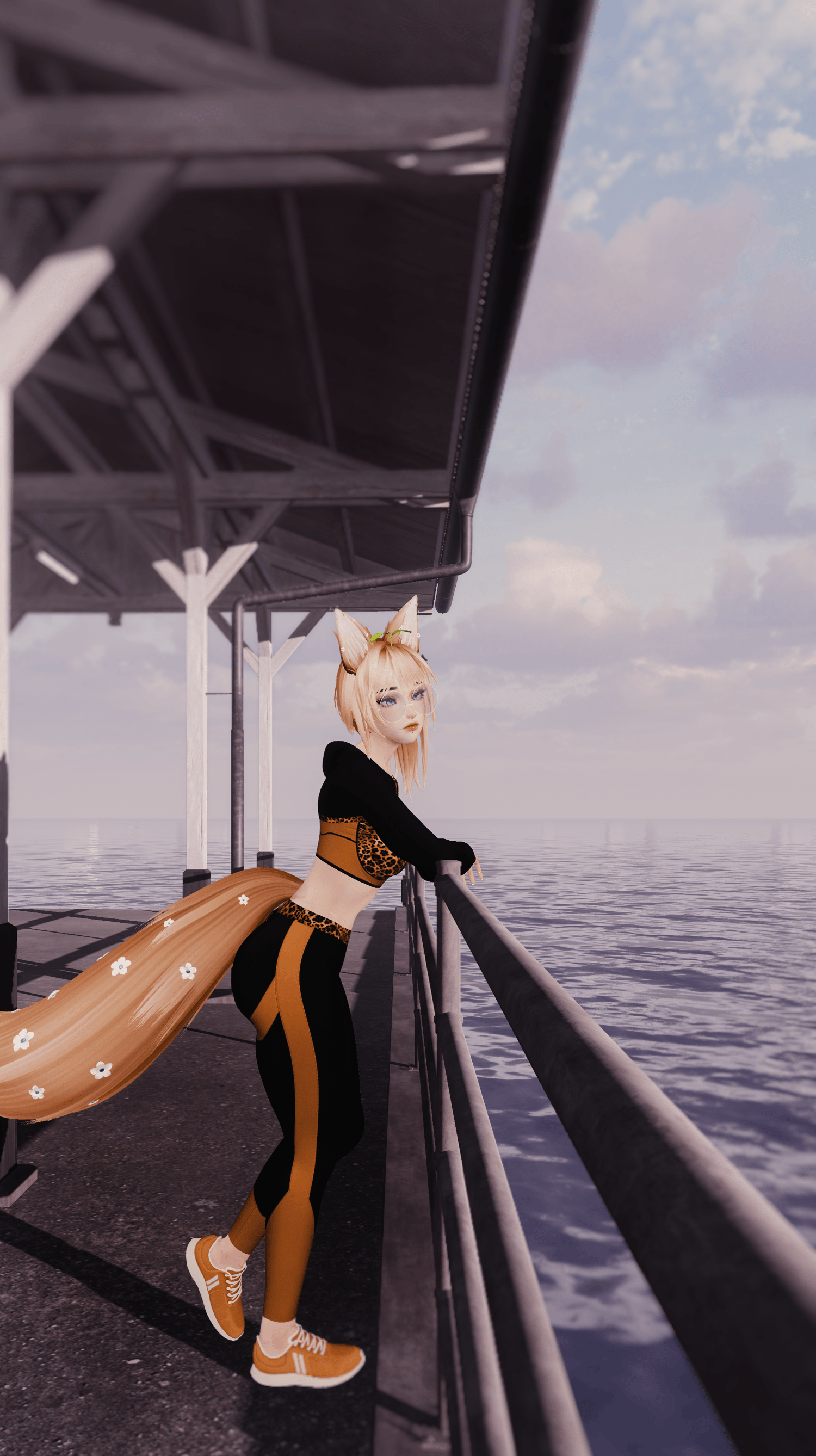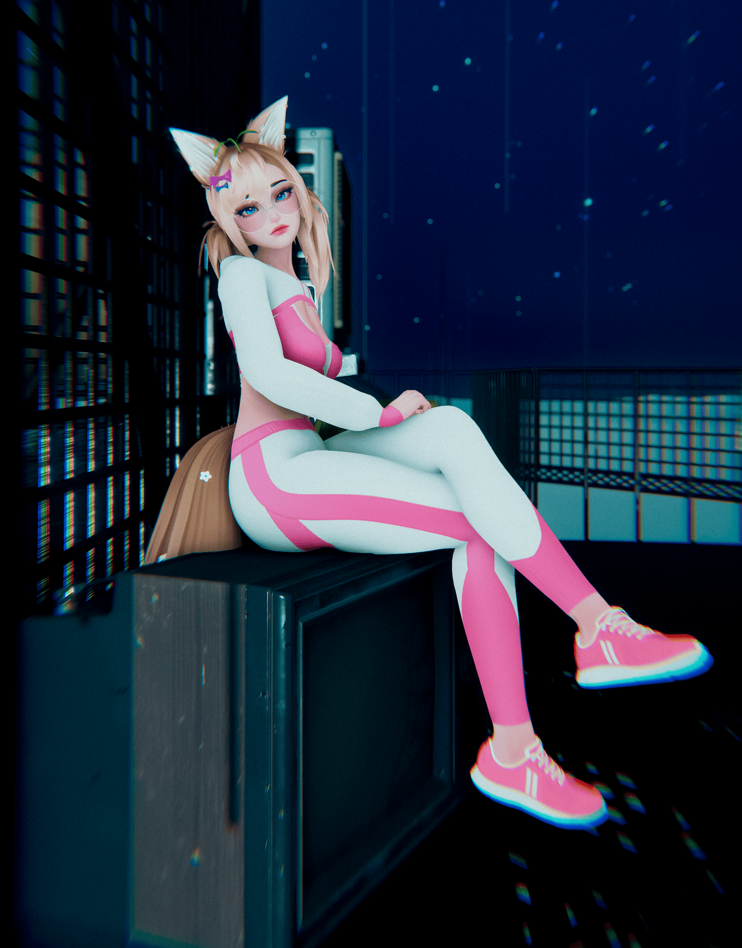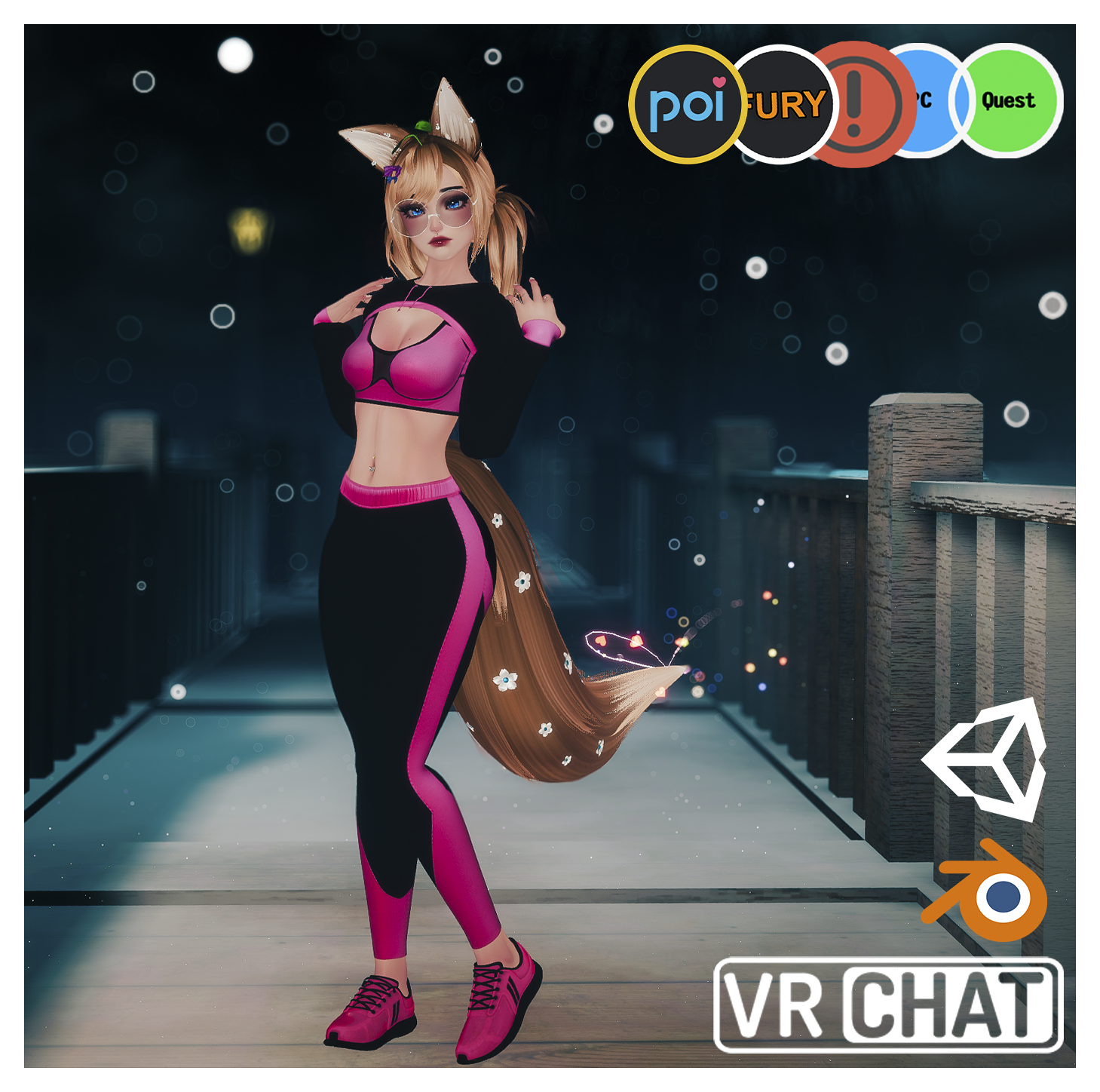 - By me: Yoga Outfit (Crop Top, Bra, Pants), All piercings, Nails (Nail Art), Fox Set (Fox Ears & Tail), Glasses, Pasties, Hair Ribbon, Poses, All particles, Thigh Highs, AFK Cloud, Moon, etc.