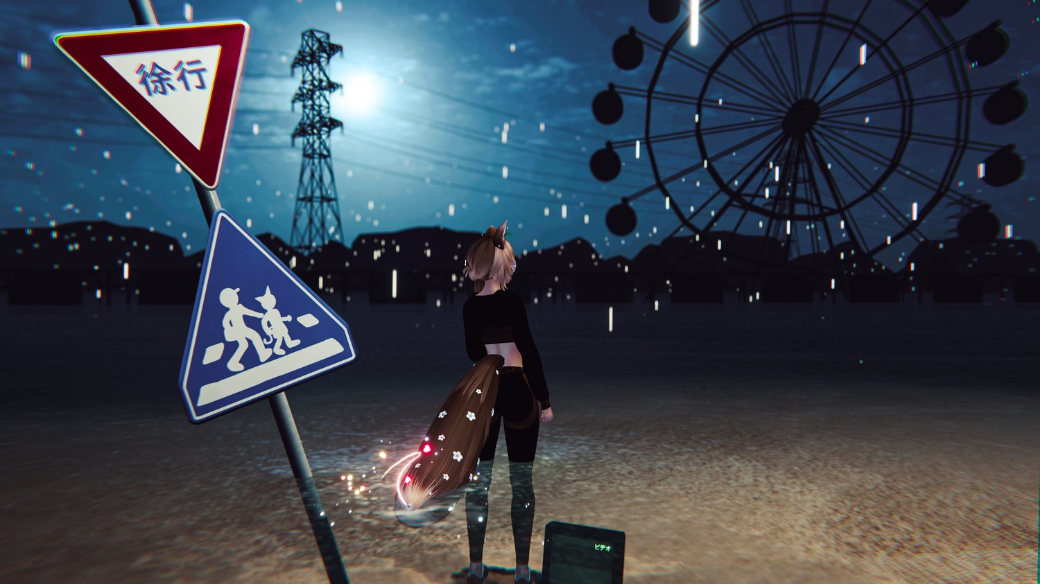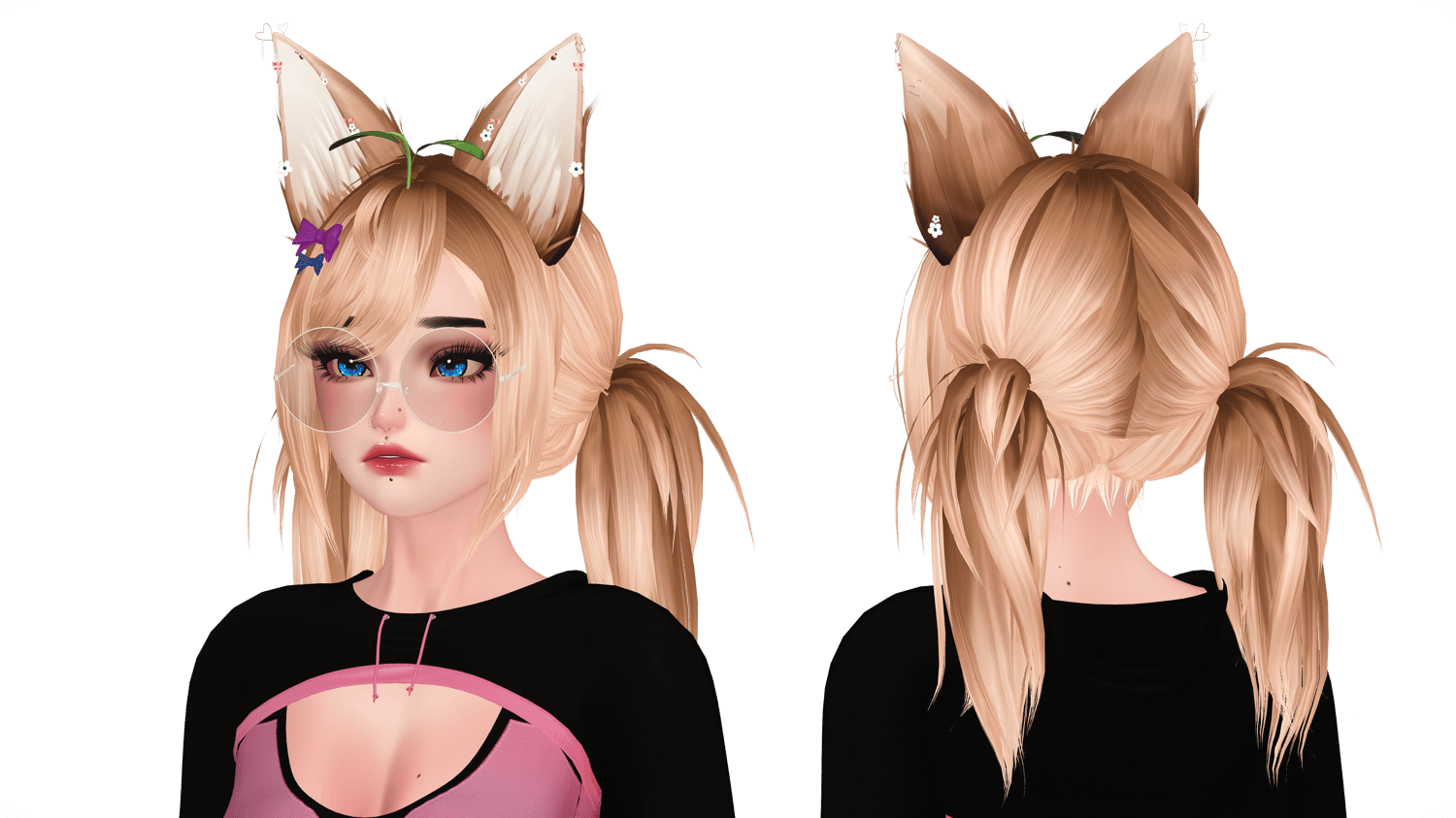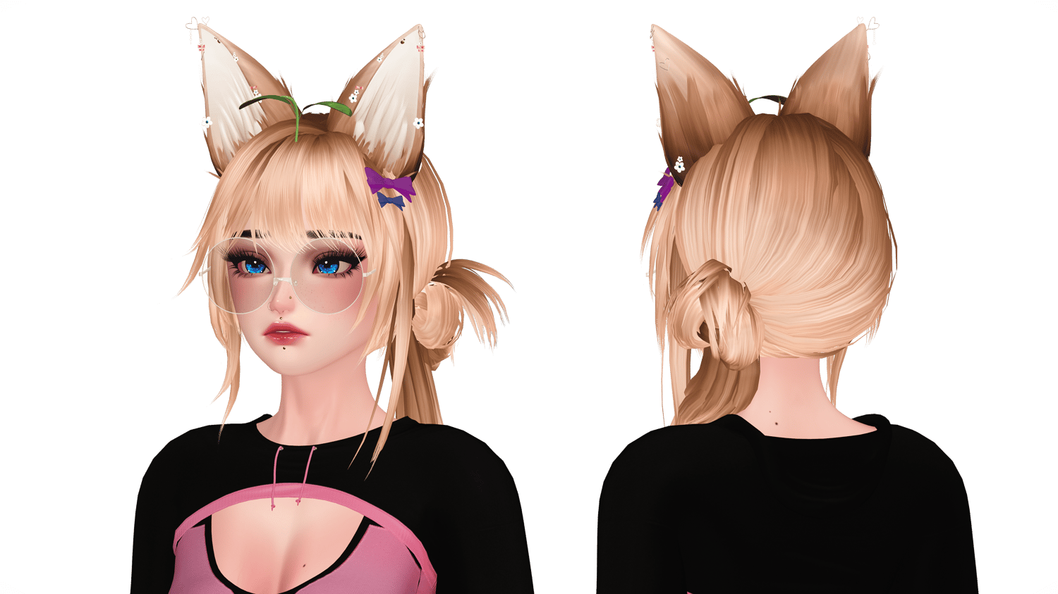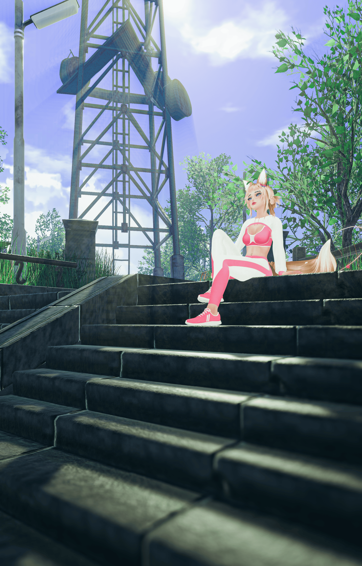 - By me: Yoga Outfit (Crop Top, Bra, Pants), All piercings, Nails (Nail Art), Fox Set (Fox Ears & Tail), Glasses, Pasties, Hair Ribbon, Poses, All particles, Thigh Highs, AFK Cloud, Moon, etc.