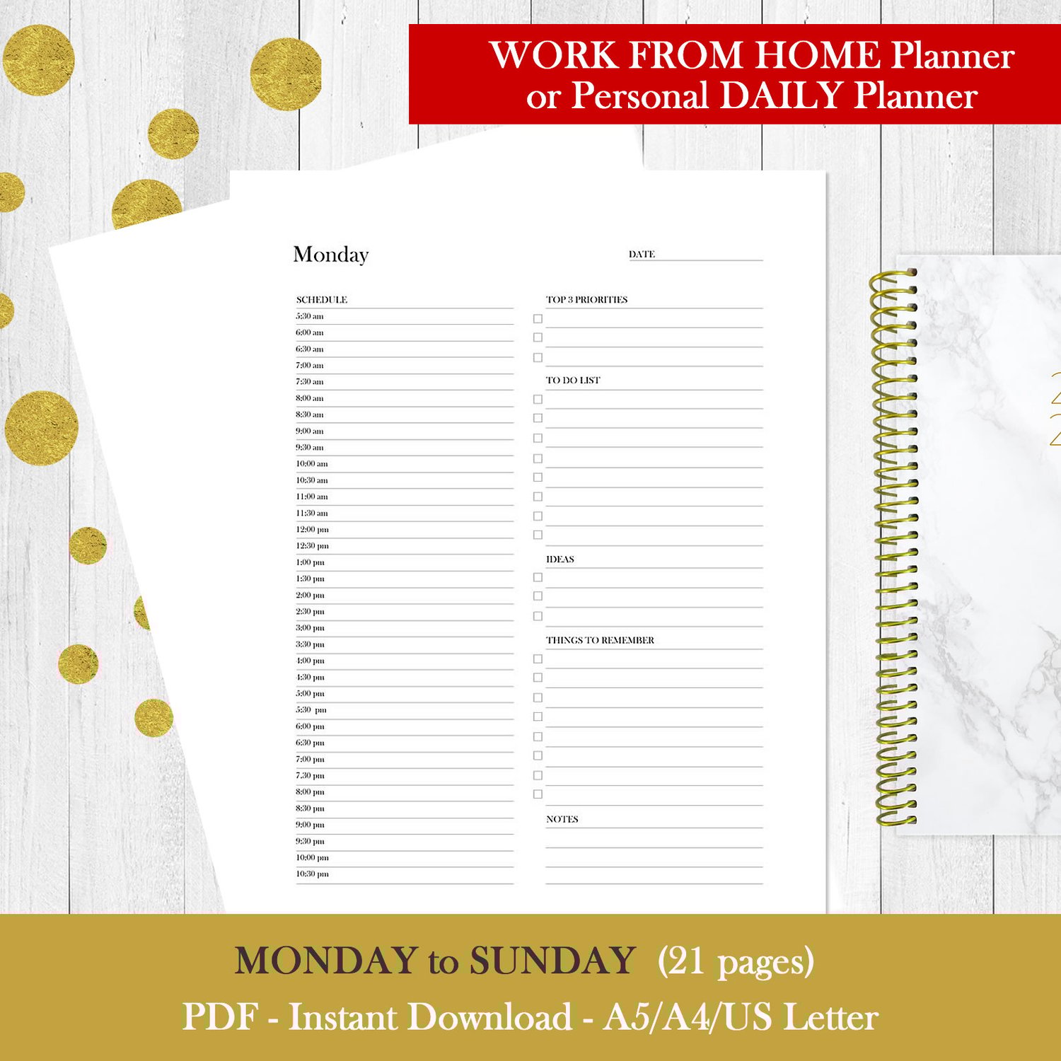 Work From Home Planner, Personal Daily Planner, Daily Hourly Planner, Instant Download, A5/A4/US Letter - From Monday to Sunday.
