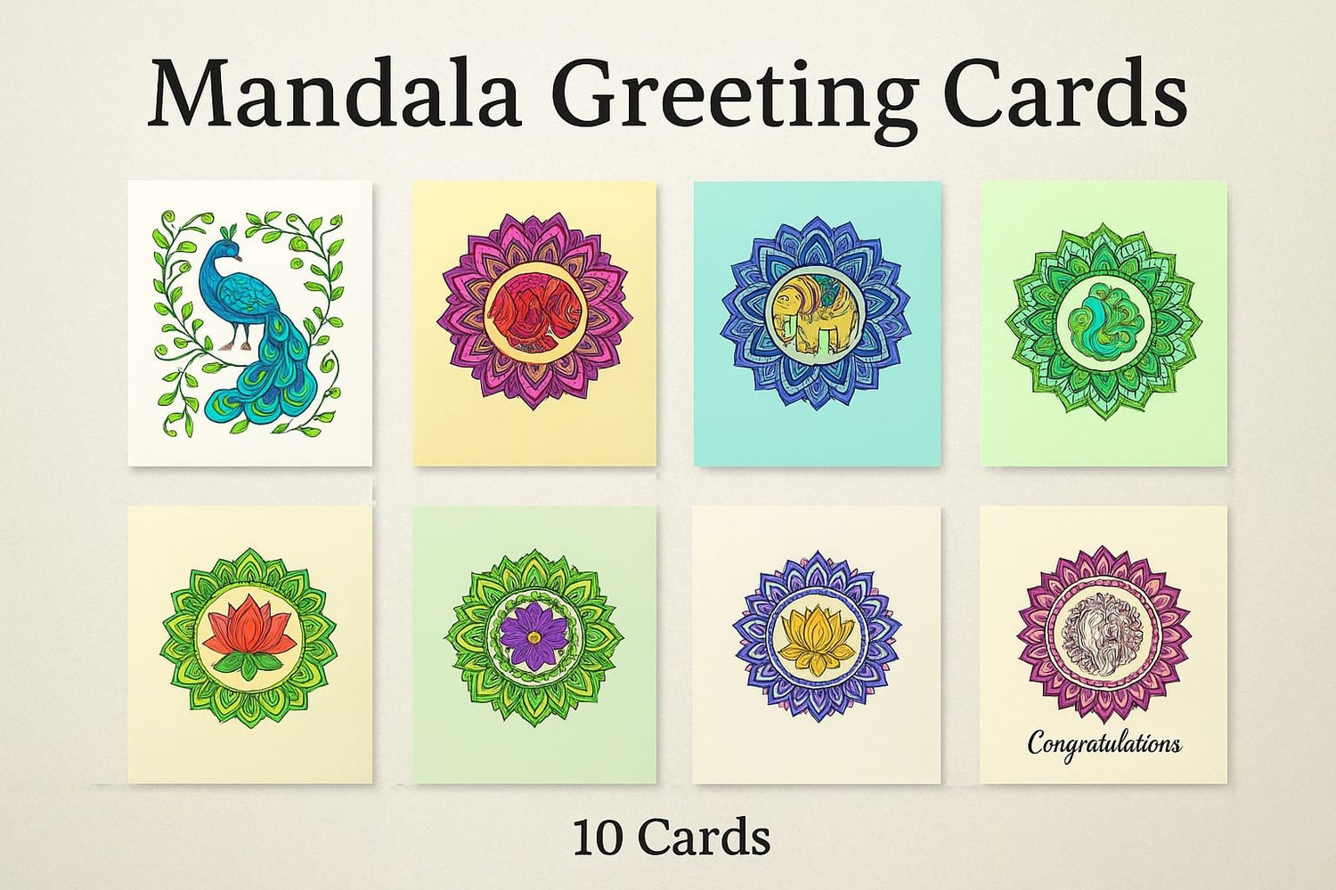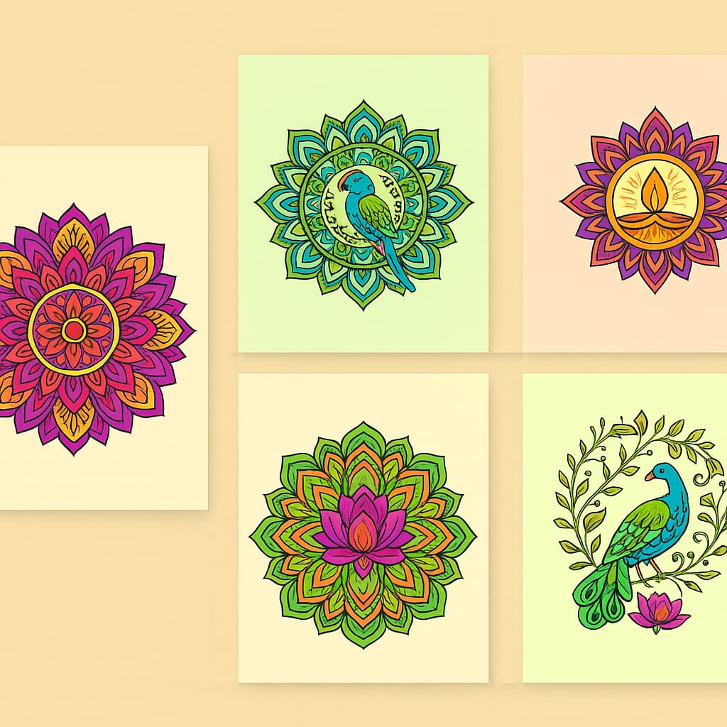 A beautiful set of 5 mandala greeting cards featuring Lotus, Diya, Fish, Floral, and Peacock designs. Perfect for printing, gifting, or digital use. High-quality 2000 × 1410 px in JPG & PNG formats.