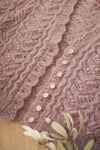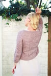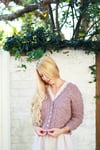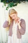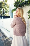Priscilla is a slightly cropped cardigan richly decorated with fine lace stitch patterns, cables and bobbles and finished with a charming wavy placket. It is worked top-down and completely seamless.