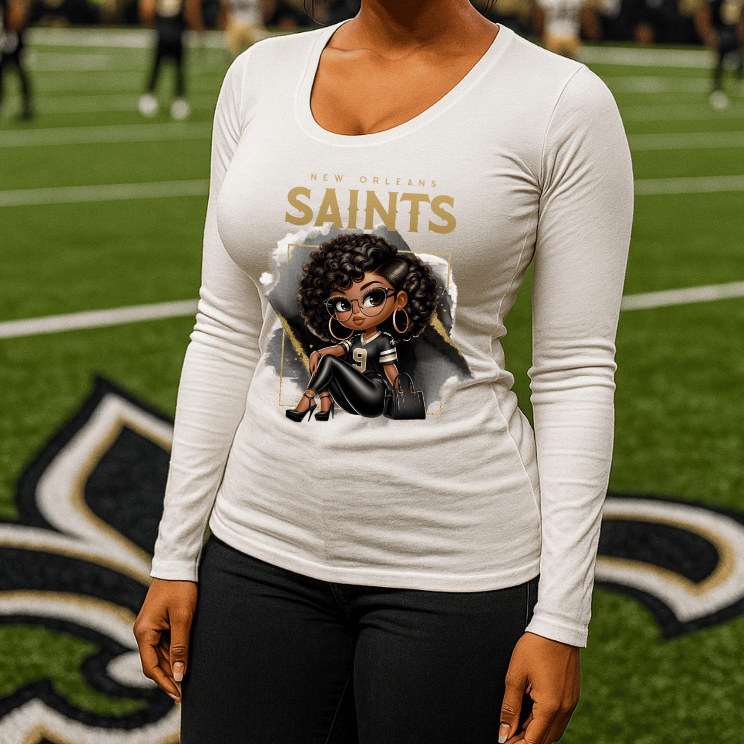 This New Orleans Saints PNG features a stylish baddie, hoop earrings, and a chic outfit rocking Saints colors, making it the perfect game day design. Use this high-quality digital file for sublimation, heat transfer, or printable crafts. Great for creating T shirts, tumblers, mugs, notebooks, stickers, wall art, and more.