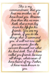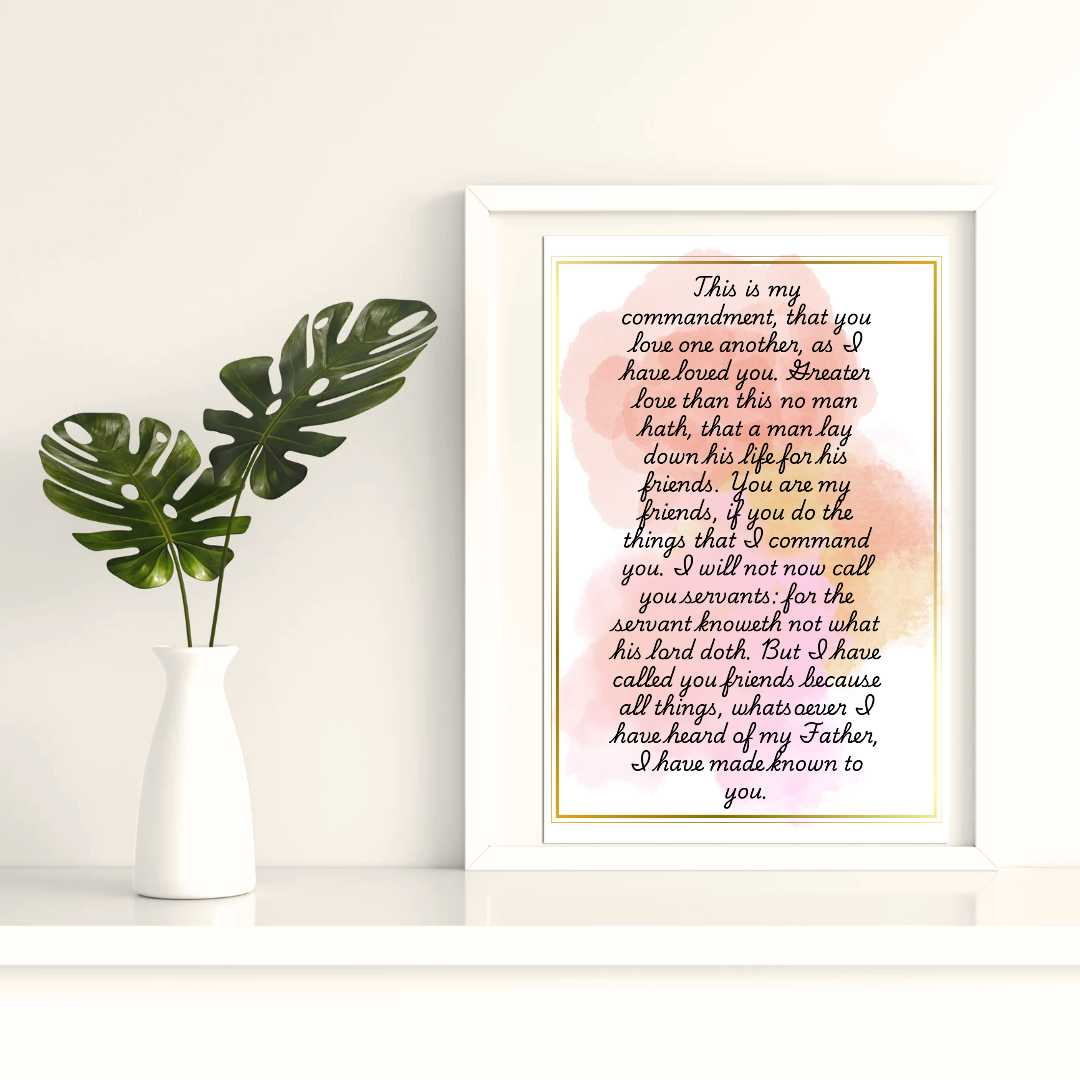 Celebrate divine friendship with this free 4x6 PNG printable inspired by John 15:13, beautifully designed in soft watercolor and accented with warm gold tones.