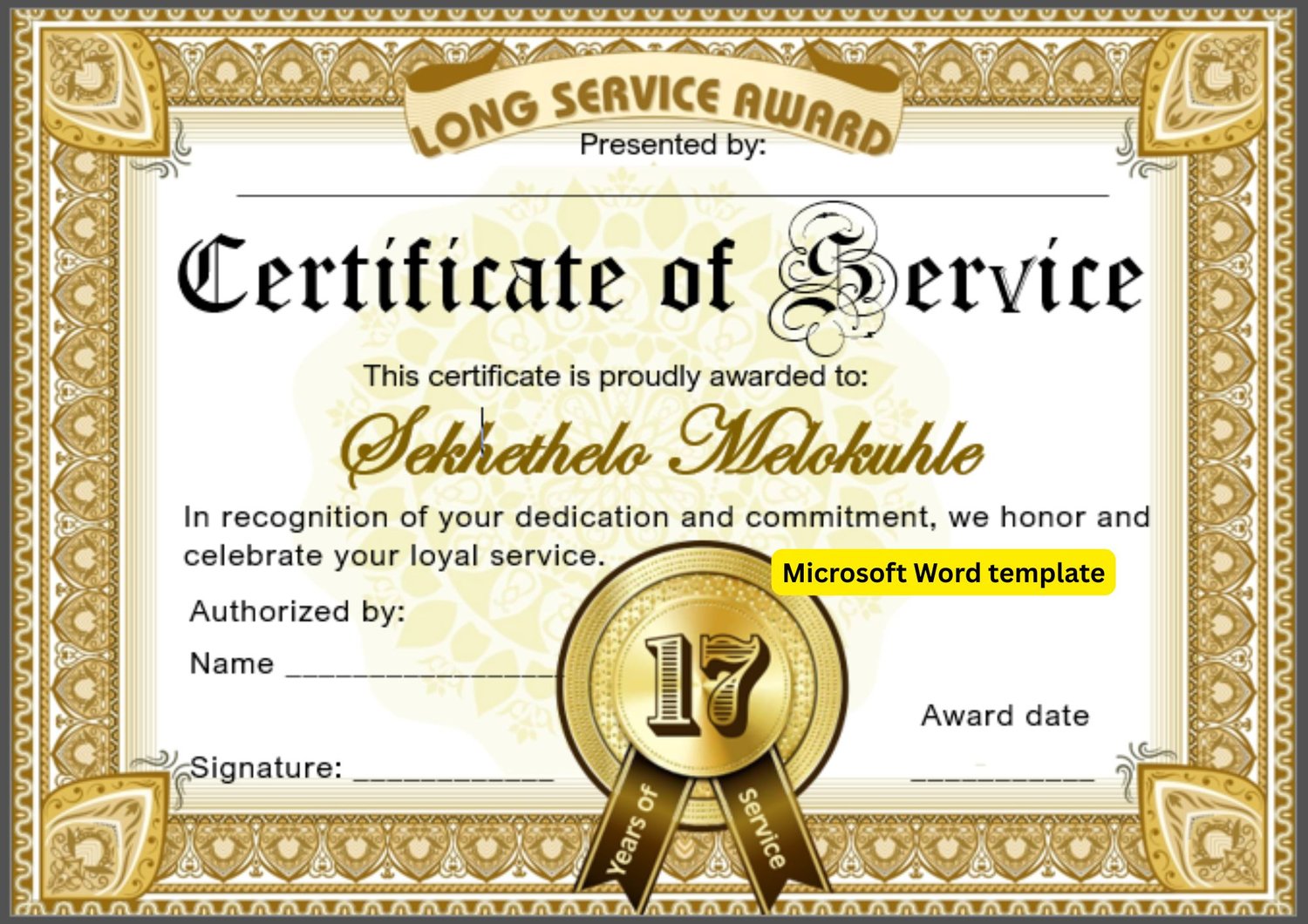 This is a professional landscape certificate template to recognize years of service. Fully editable in Microsoft Word — customize with names, dates, and details