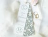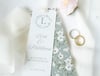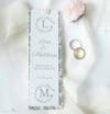 Sur le volet supérieur blanc, les initiales des mariés apparaissent au centre d’une couronne de branchages en filigrane, en écho au motif du fond.