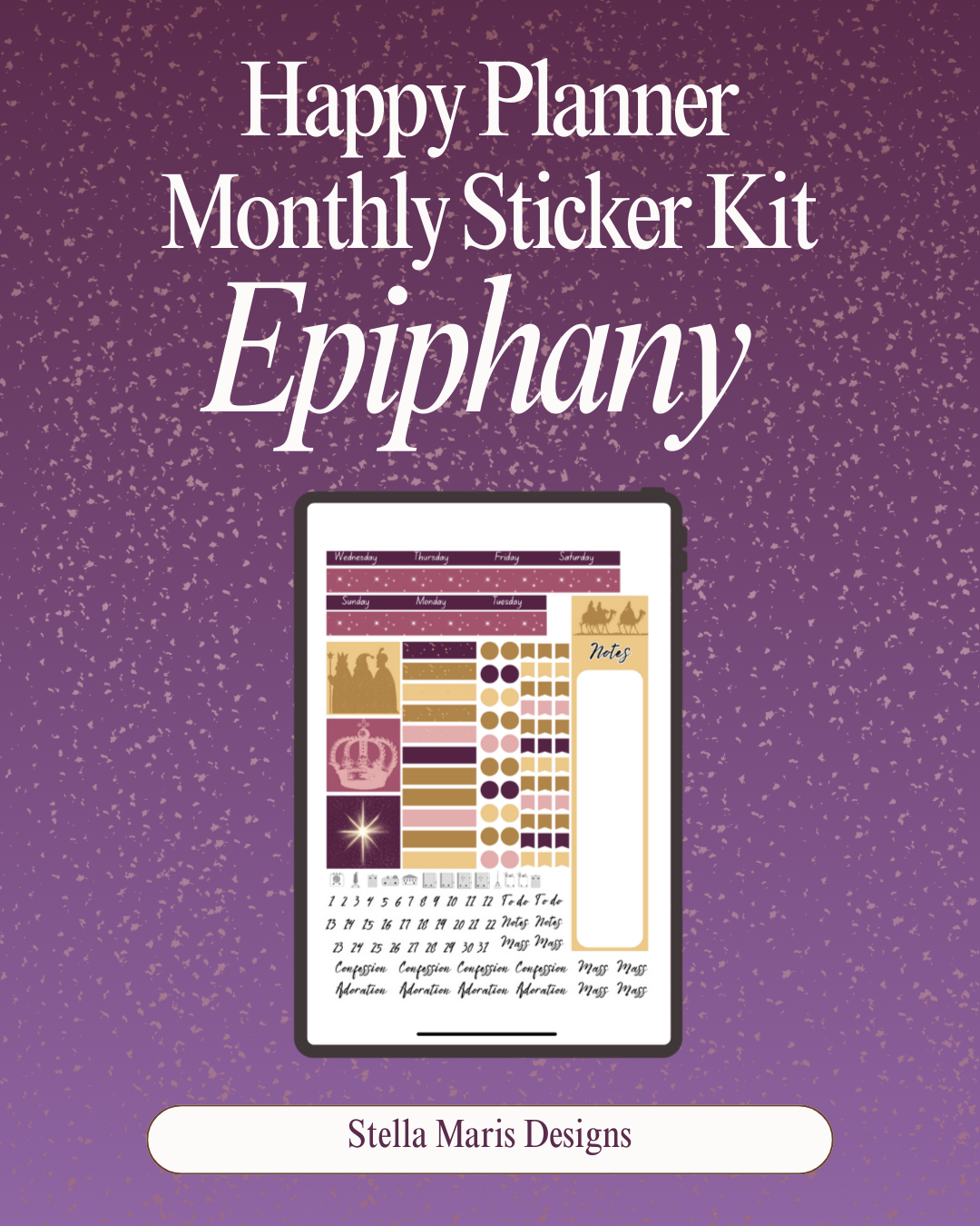 - Full Epiphany‑themed monthly sticker kit sized for Happy Planner Classic