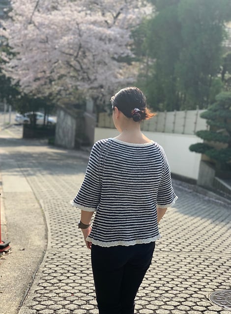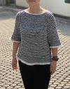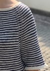 Marine T is a simple striped sweater. This sweater is worked from top down, worked in the round for most of the body and sleeves. It’s a very simple and easy pattern so appropriate for all levels of knitters.
