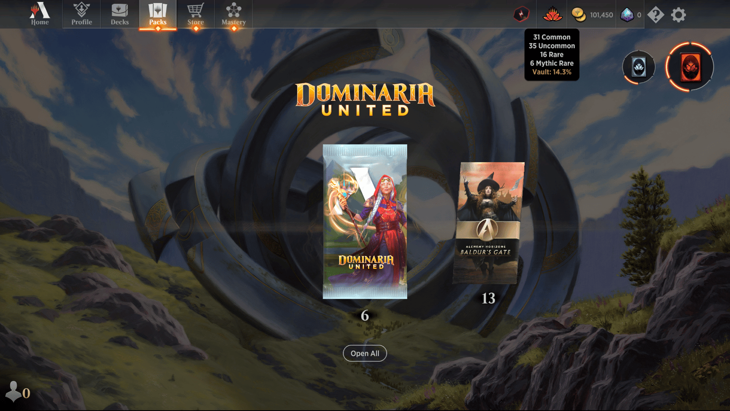 100,000 Gold + 6 Dominaria Packs + 13 Baldur's Gate Packs + Wildcards