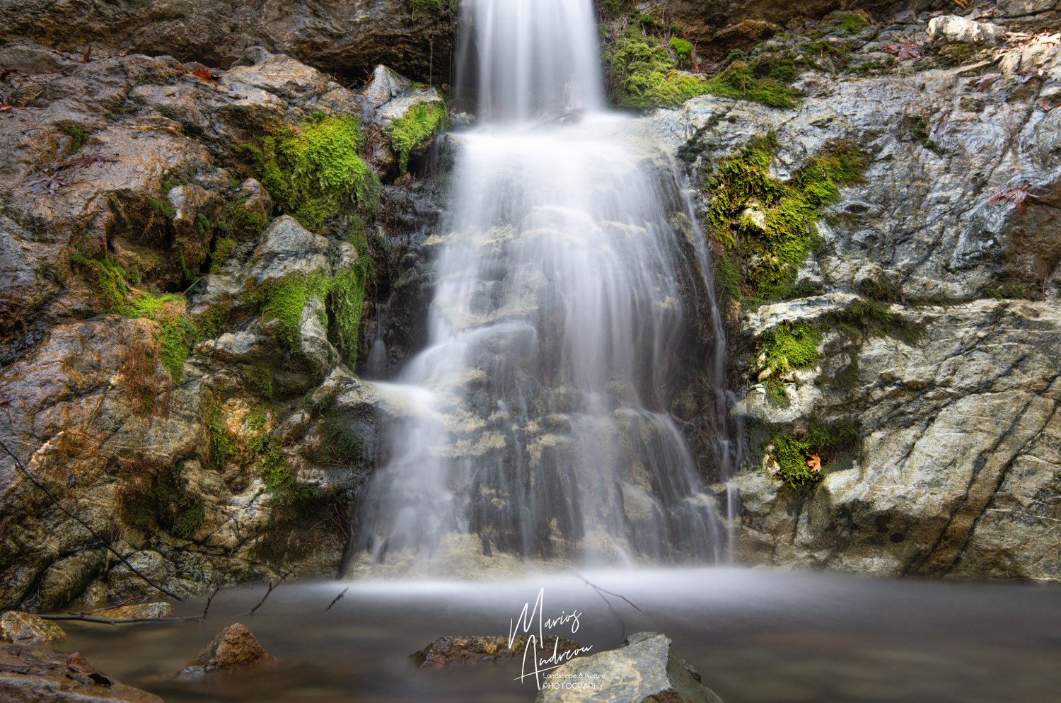 A moment of stillness in a world of motion. A gentle cascade of water, captured in a dreamy long exposure, spills into a tranquil pool below. This photograph transports you to the serene beauty of the Mesa Potamos waterfall, where the soft murmur of the water provides a moment of peace. The vibrant green moss clinging to the rugged rock face adds a touch of life and color, making this a perfect piece to bring the calming essence of the forest into your home or office.