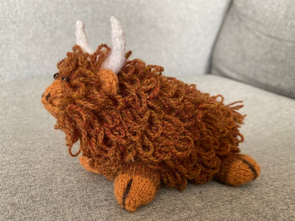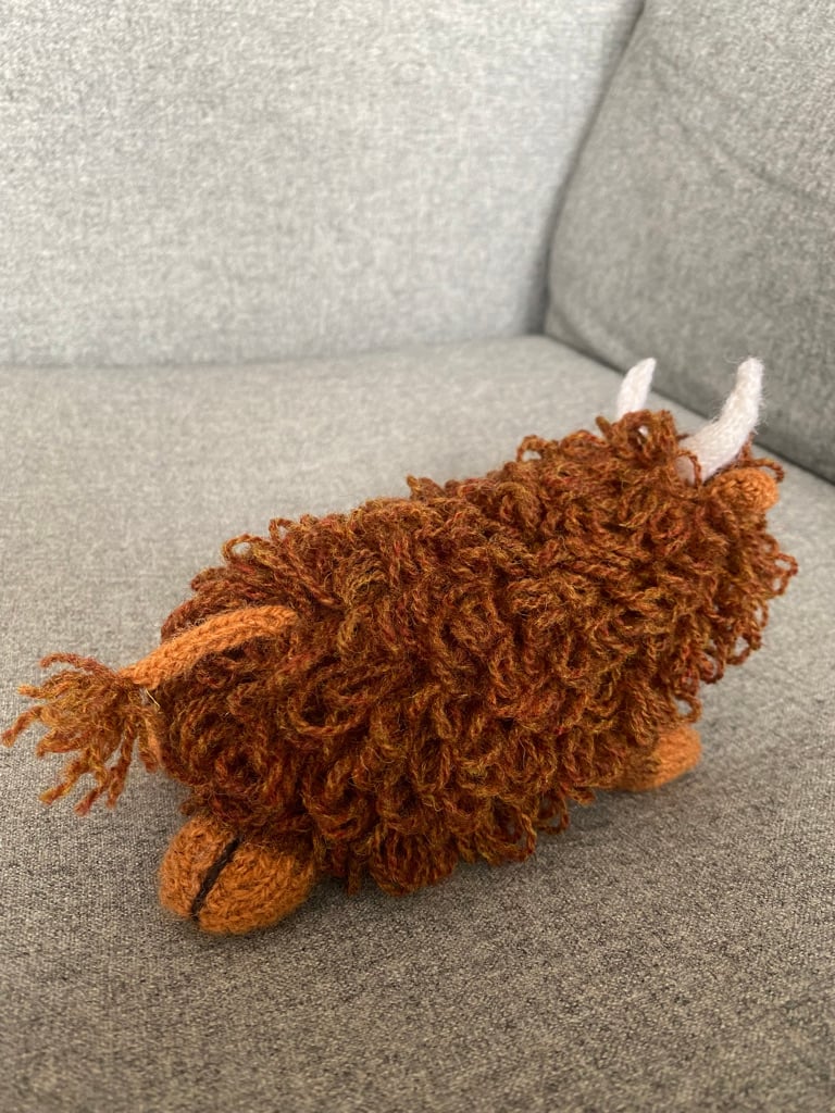 Loop stitch is used to recreate their unusual double coat of hair, the longest of any cattle breed, helping them deal with Highland weather: lots of wind and rain.