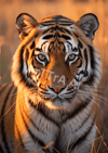 AI artwork featuring a tiger captured during the golden hour, portraying the majestic creature bathed in the warm, golden tones of the setting sun.