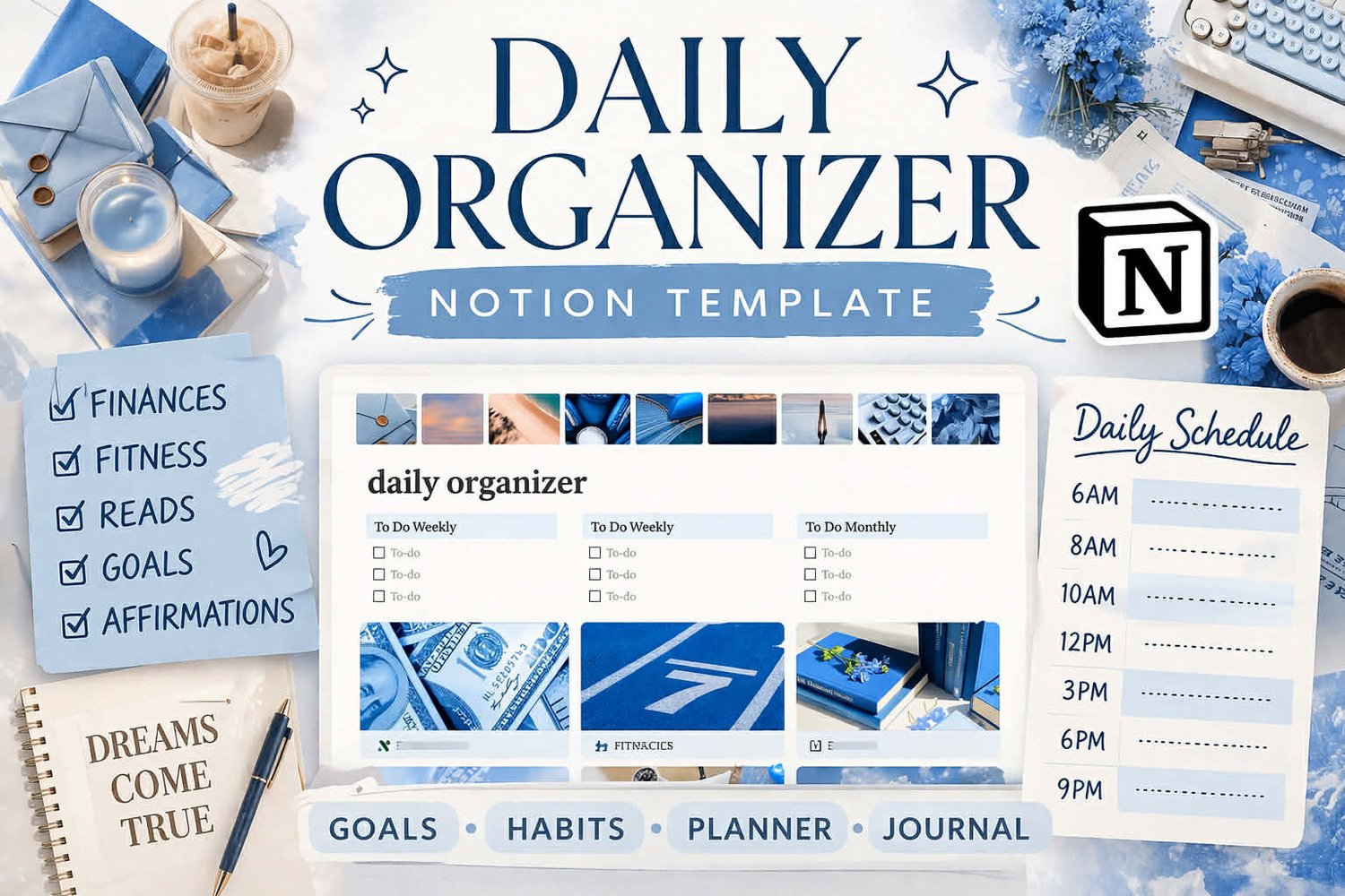 Blue Aesthetic Beginner Friendly Daily Organizer Notion Template | All-in-One Life Planner | Habit Tracker, Finance Tracker, Daily Schedule, Goals & Journal | Digital Planner