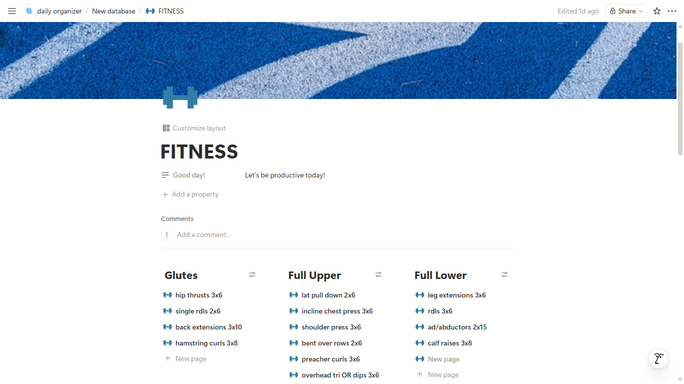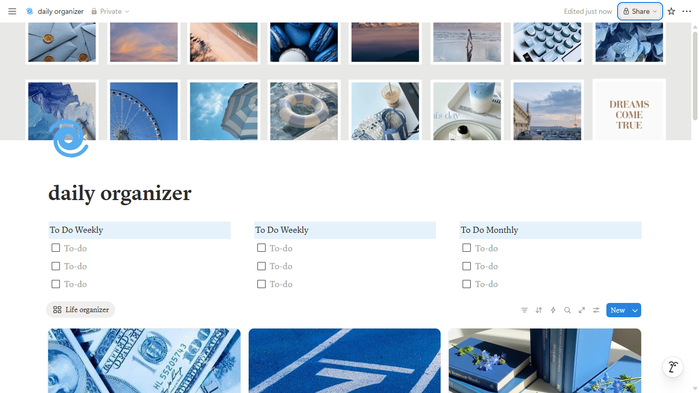 Designed with a clean blue aesthetic, this Notion template helps you stay focused, productive, and inspired every day.