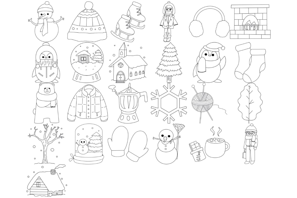 Stamps include: Snowman, winter hat, ear muffs, ice skates, characters, fireplace, penguin, bear, snow globe, church, tree, stockings, jacket, snowflake, mittens, stockings, snowy cottage, hot chocolate and others.