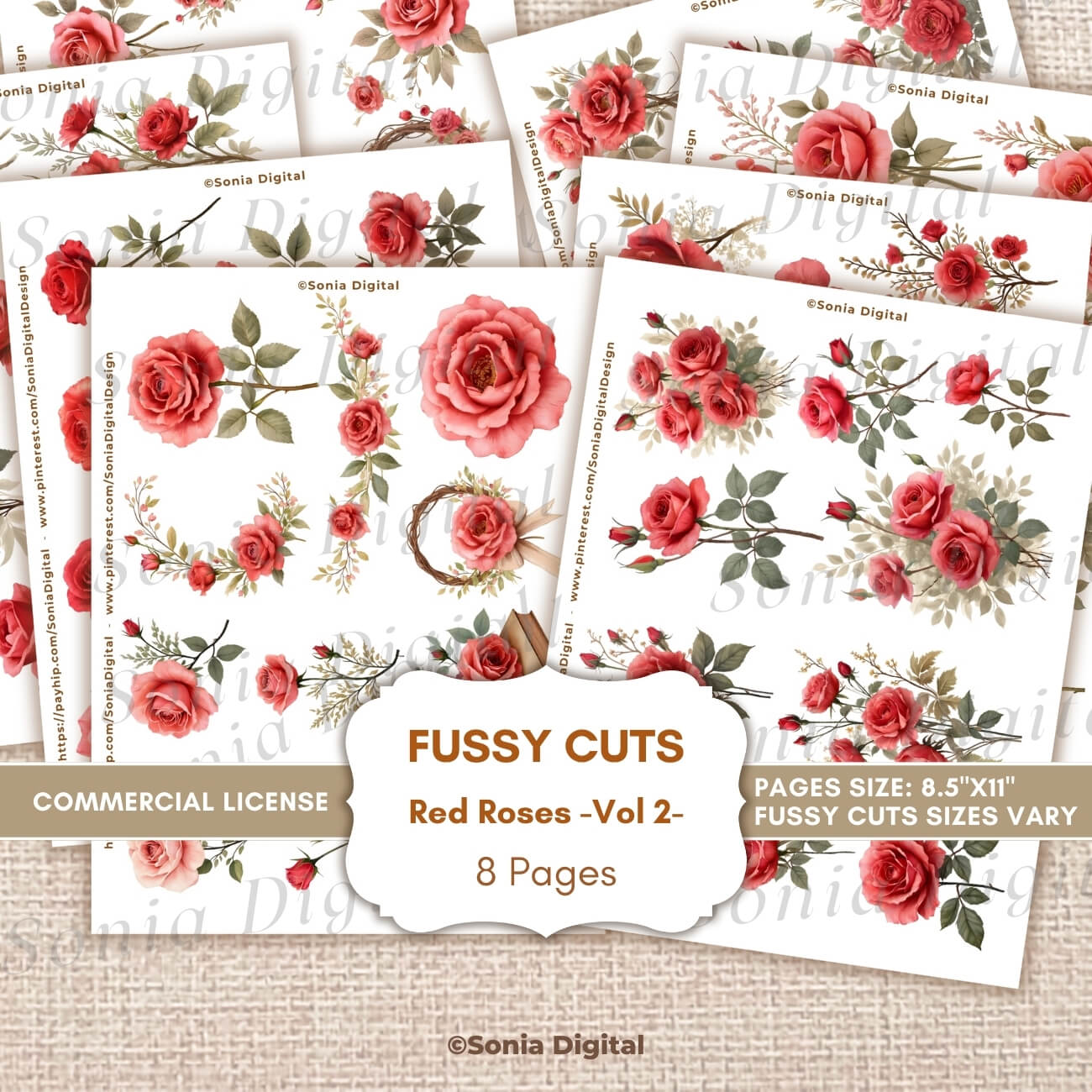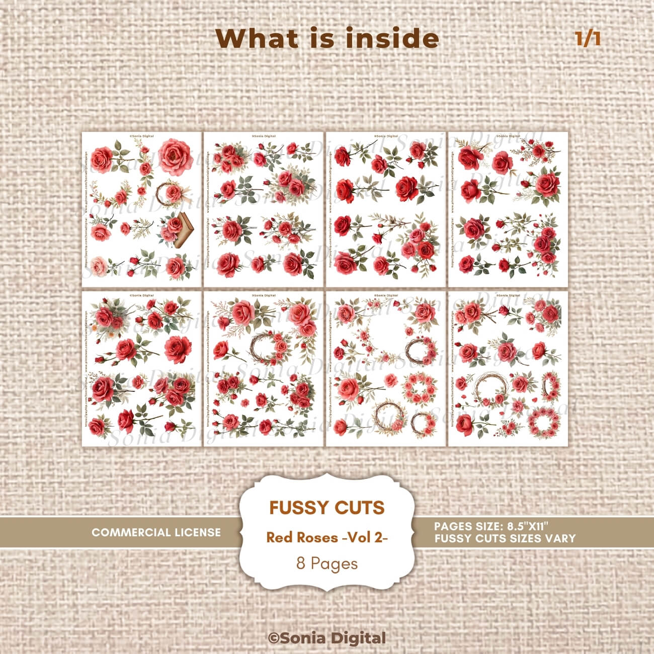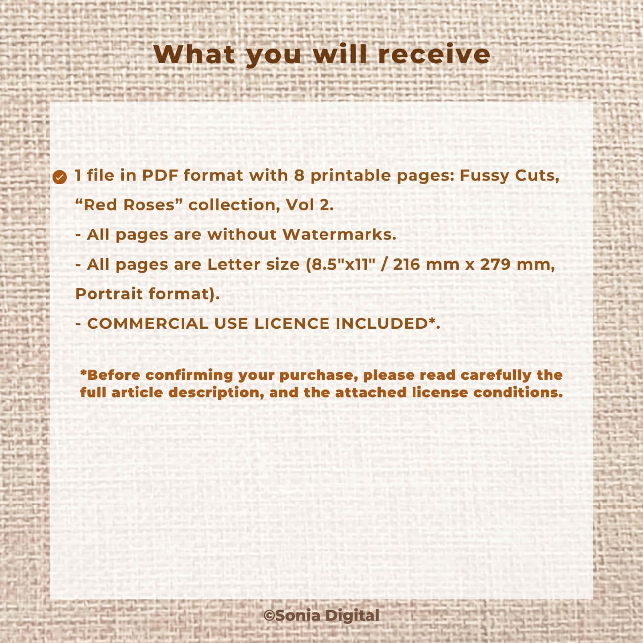 🔸8 printable pages containing Fussy Cuts, “Red Roses” Collection (Vol 2). In Letter size (8.5”x11”). All pages are sold watermark-free. Fussy Cut Sizes vary. Commercial use license included*.