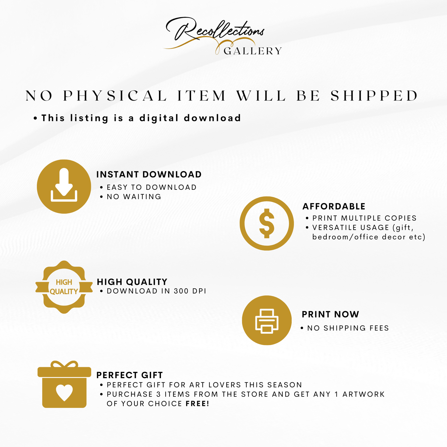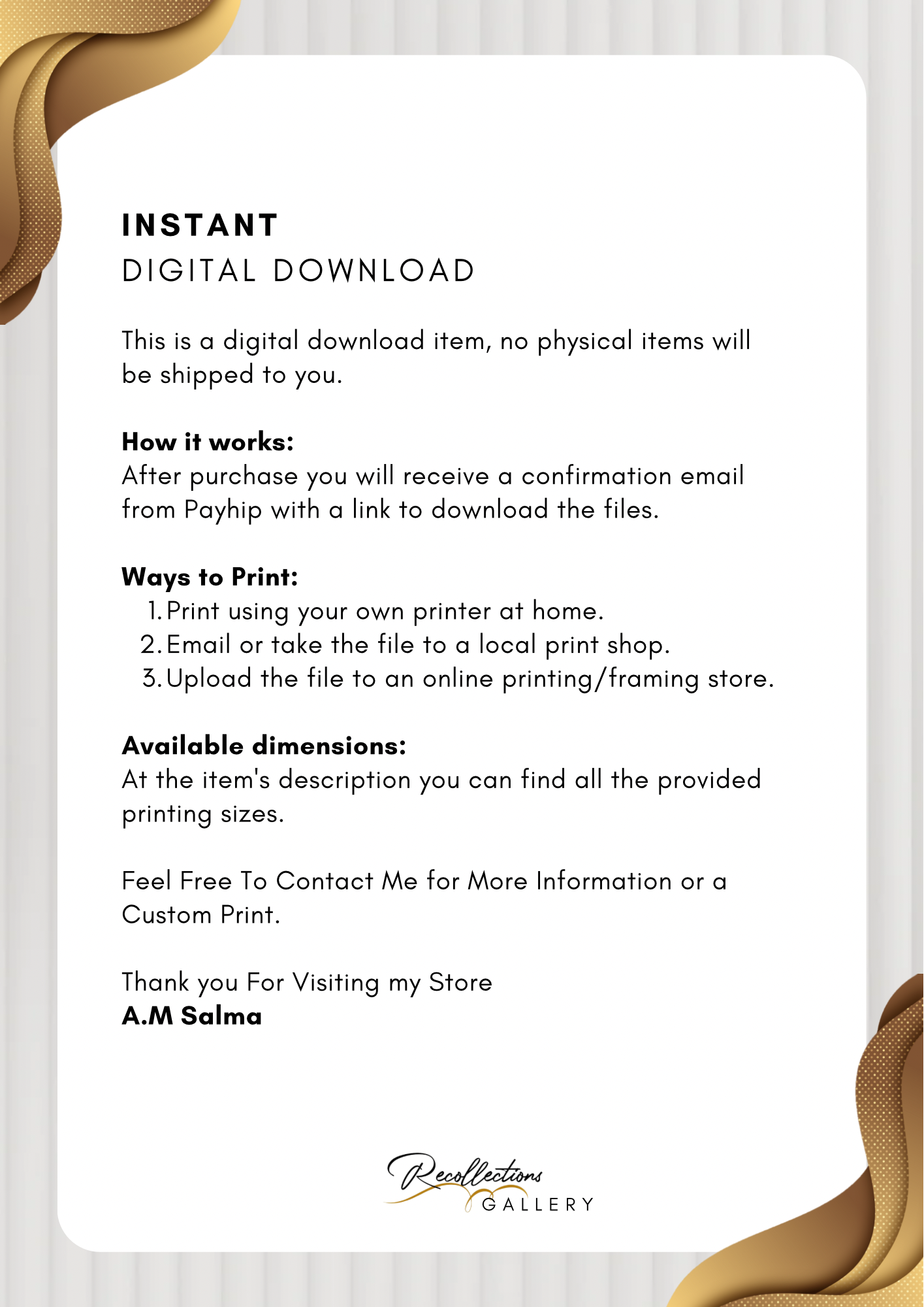 Please not that this is a DIGITAL DOWNLOAD listing. No physical products will be shipped to you unless you request for that via Instagram. After your purchase is confirmed, you will review an email from Payhip with a link to your downloadable high-quality JPG files. It could take a few minutes to reach your inbox. Be sure to check your spam/junk folders in case it does not come into your inbox after a few minutes.