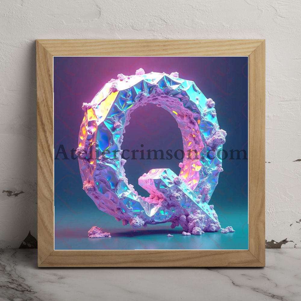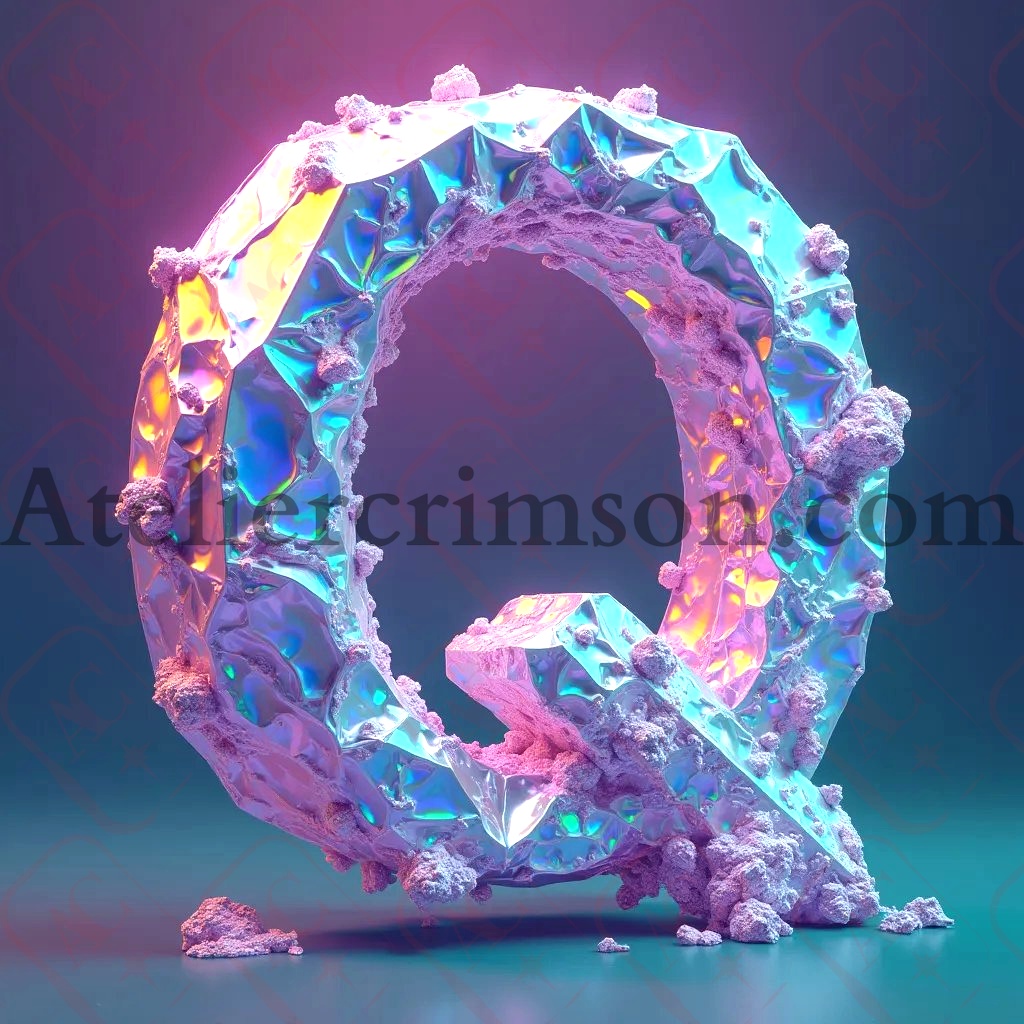 The letter Q crystalline Retro Futuristic C A unique creation blending retro-futuristic aesthetics and geometric elegance. Each character is sculpted from iridescent crystals in vibrant, nostalgic hues, set in delicate silver filigree. Against a gradient background transitioning from deep purple to teal blue, this digital artwork captures the essence of 80s-inspired digital art with a touch of crystalline luxury. Perfect for typography enthusiasts, digital art lovers, and those who appreciate retro-futuristic aesthetics.