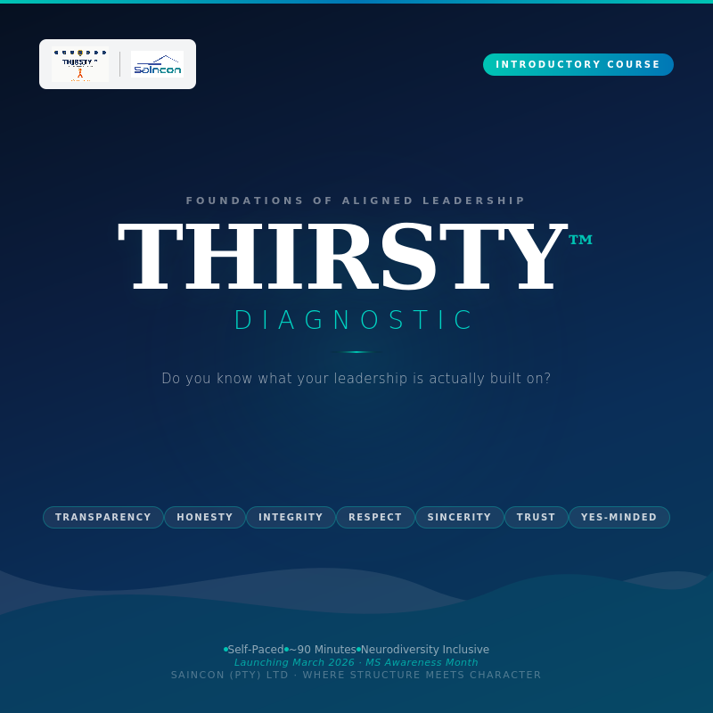 The THIRSTY™ Diagnostic is a 90-minute, self-paced online course that asks you to do what most leadership programmes never do: audit who you actually are as a leader — not who you intend to be.