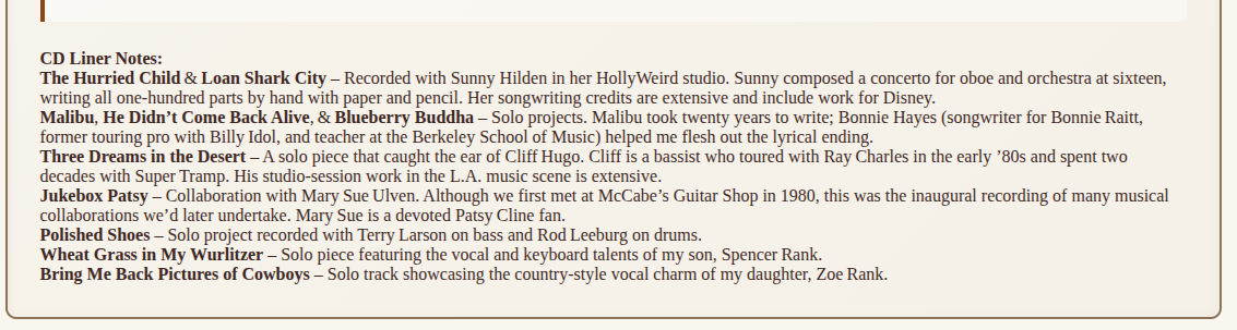 Ten song CD with all original music. Acoustic studio recordings.