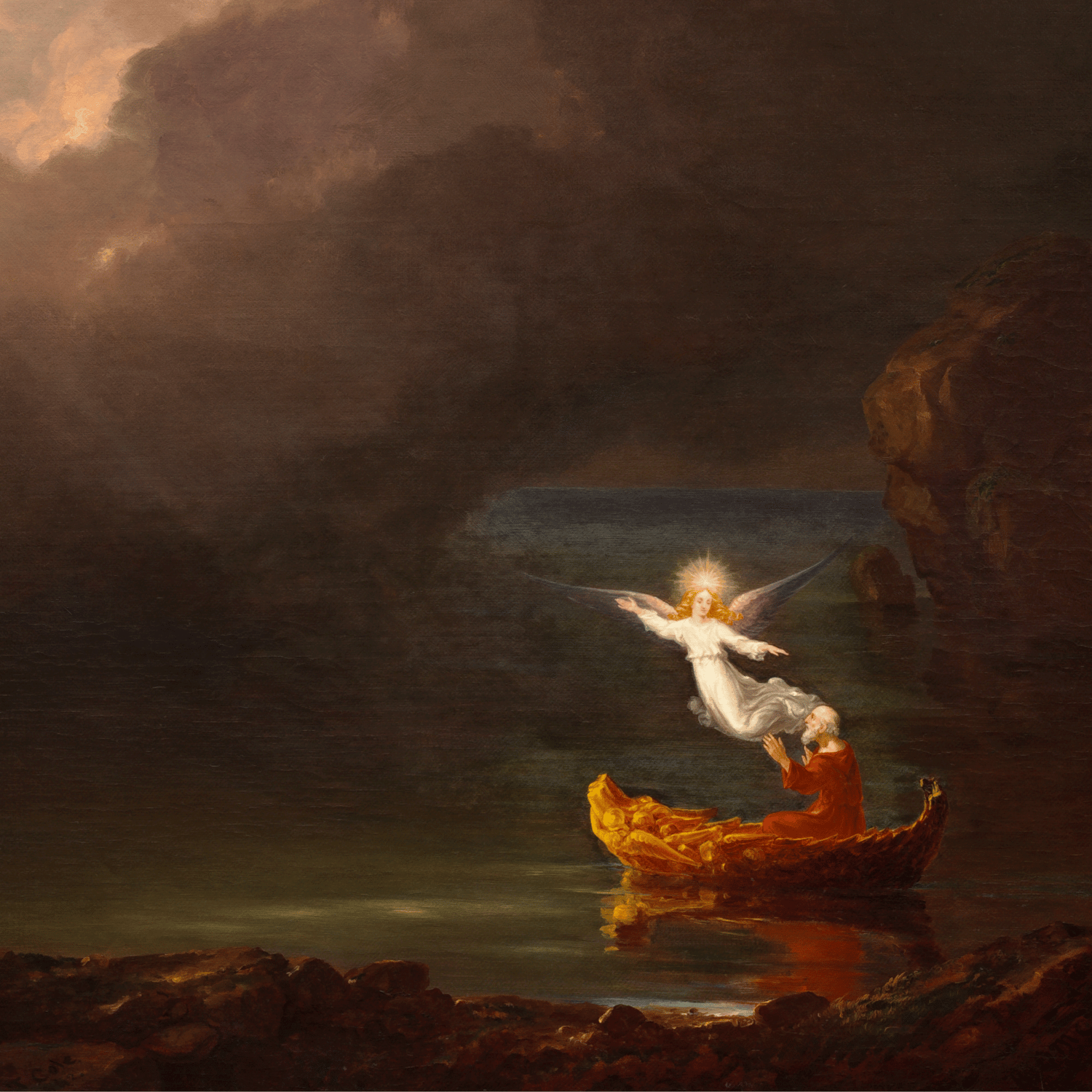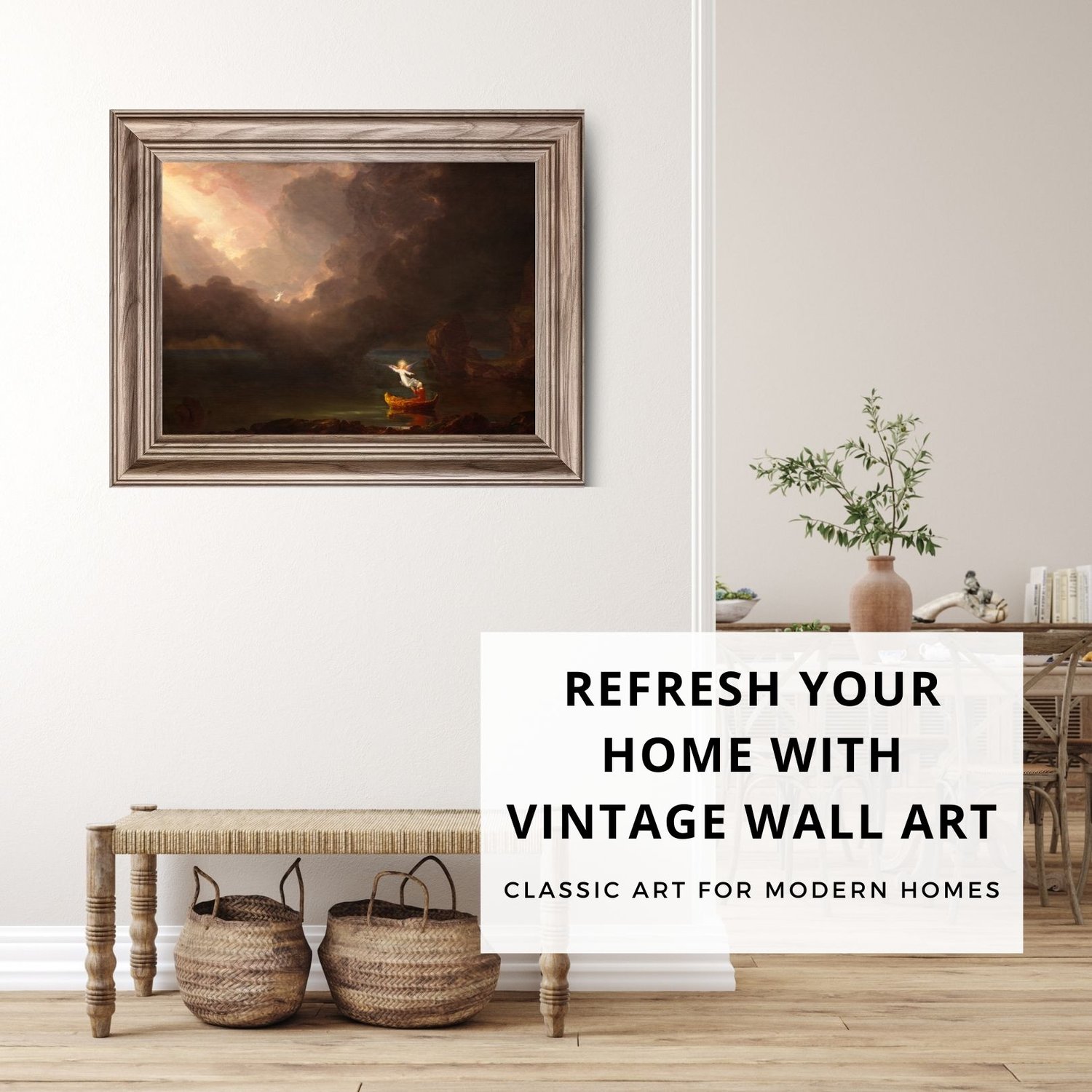 Experience the profound journey of life through Thomas Cole's masterful painting, The Voyage of Life: Old Age. It captures the beauty and complexity of our existence, blending rich symbolism with stunning landscapes. Old Age explores wisdom, reflection, and the return to a spiritual connection in the face of mortality. This painting is a thoughtful example of 19th-century Romanticism, focusing on humanity's connection to nature and the divine, as well as the philosophical exploration of life’s transient nature.