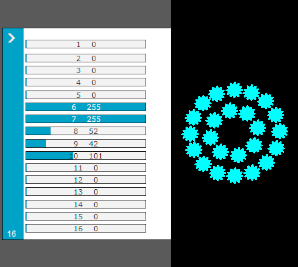 * Verifique, con un Fixture de pruebas (click), que coincidan estos canales: 6 Dimmer, 7 Strobo/Shutter, 8 en el valor 52 = Color Celeste, 9 en el valor 42 = Gobo de Sol, 10 Prisma (ver tercer foto).
