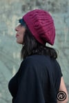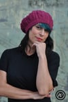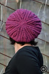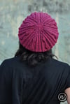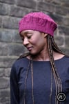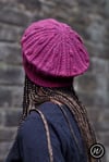 The cables on this brim follow though into the body where they mingle with a delicate leaf lace pattern creating an intricate and beautiful pattern. The deep brim enhances the slouch, and can be worked shorter for a beret finished if preferred.