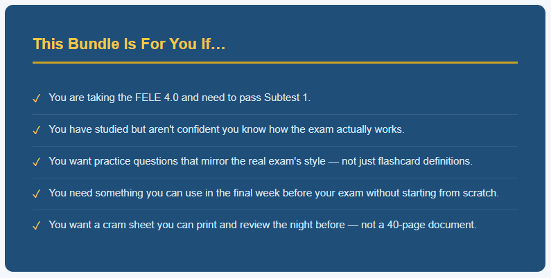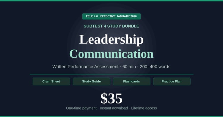 Everything you need to walk into the exam prepared โ study guide, flashcards, and cram sheet. Aligned to FELE 4.0. Instant download.