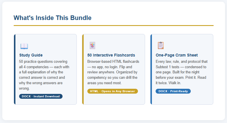 ๐ One-Page Cram Sheet: Every law, rule, and protocol that Subtest 1 tests โ condensed to one page. Built for the night before your exam.