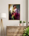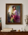 A work of art that will transform any room into a warm and inviting space. Exquisite oil painting of an Indian girl in a saree. Painted with thick impasto strokes, this piece features a beautiful blend of warm and cool tones that create an elegant and timeless effect.