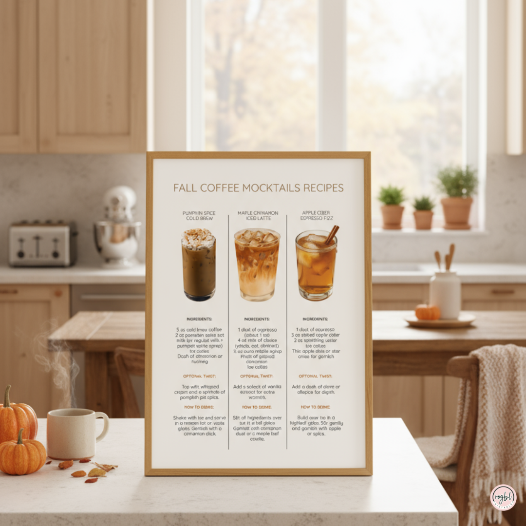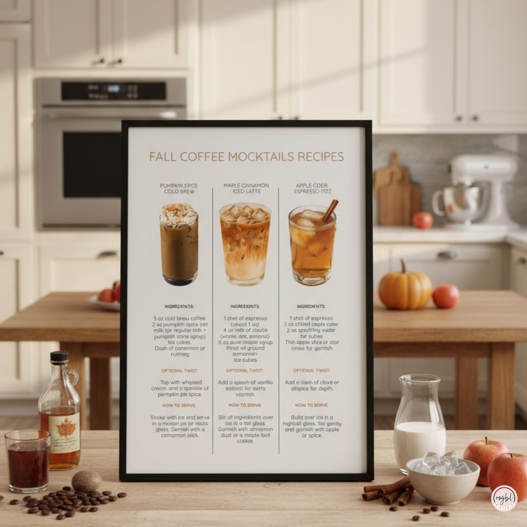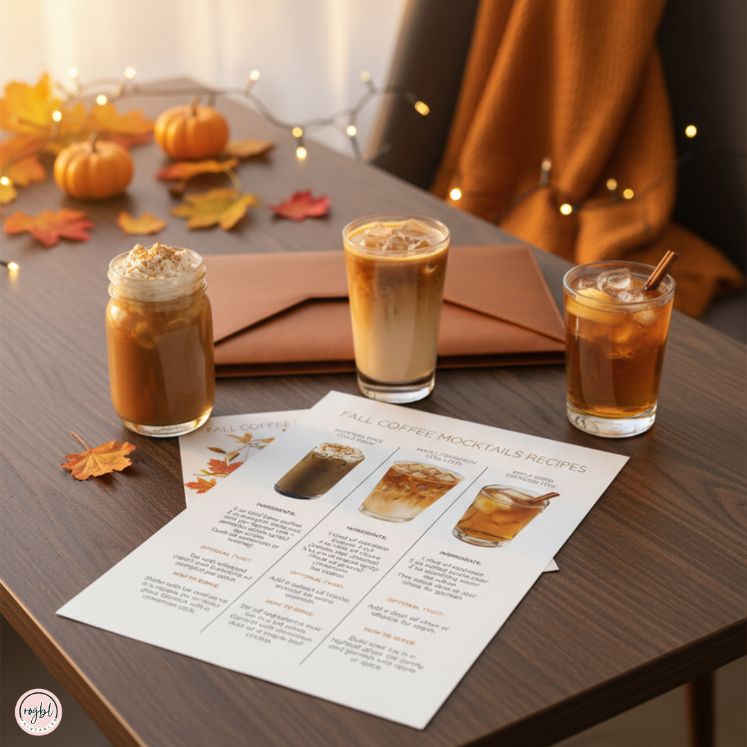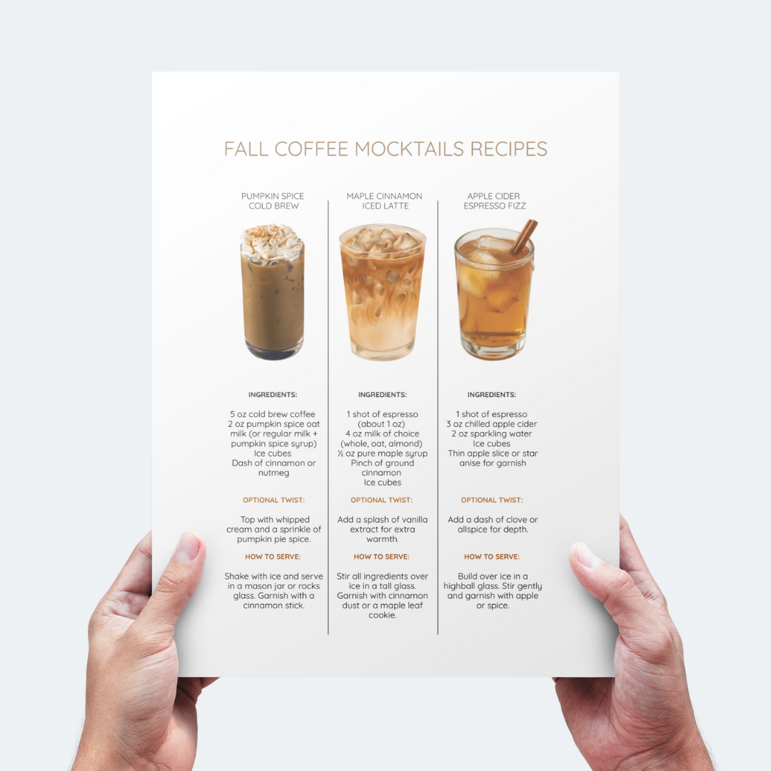Celebrate fall flavors with this digital coffee mocktails recipe guide. It includes three creative step-by-step illustrated drinks: Pumpkin Spice Cold Brew, Maple Cinnamon Iced Latte, and Apple Cider Espresso Fizz. Perfect for home baristas, coffee shops, or anyone looking for seasonal and alcohol-free coffee drinks.