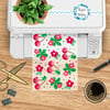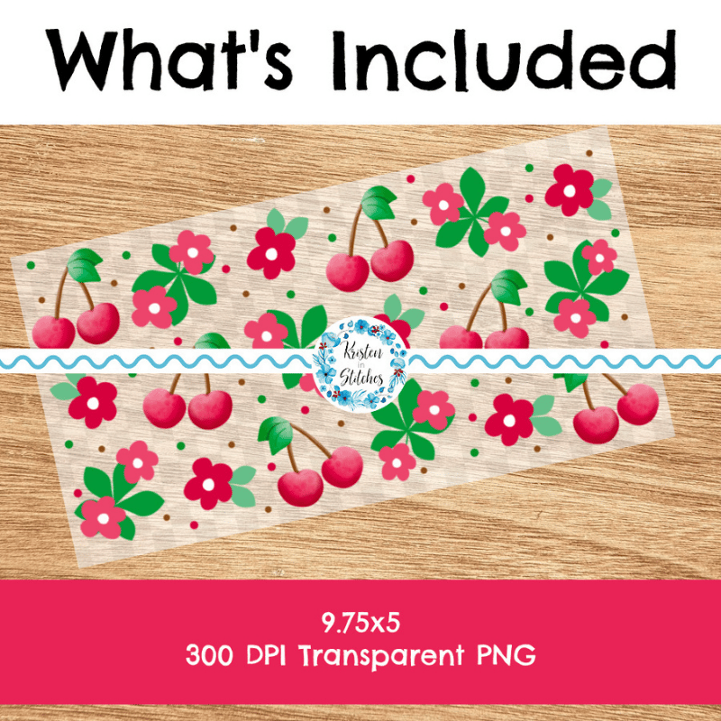 Features red/pink cherries and flowers.