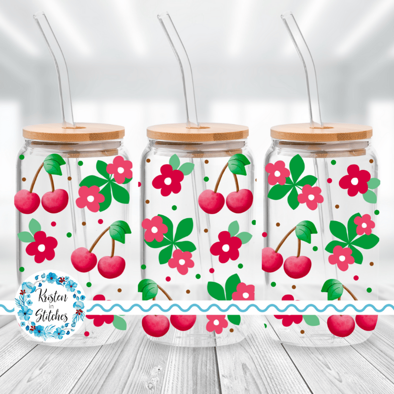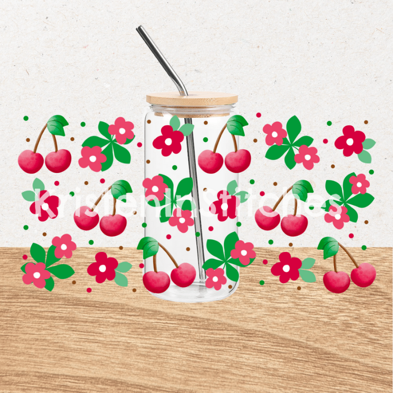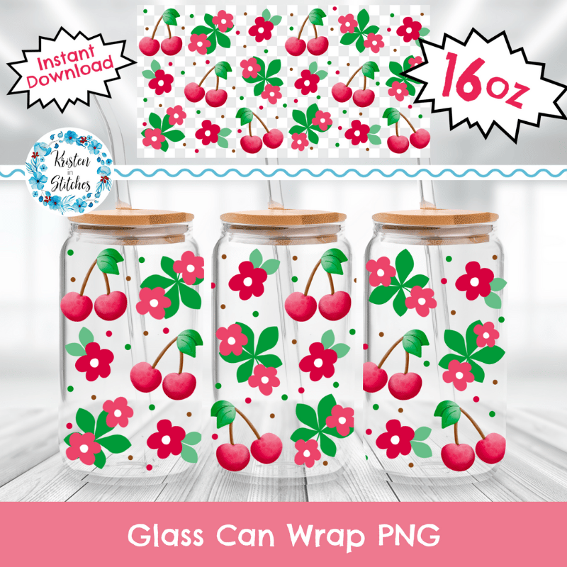 Red Cherries and Daisy Flowers Glass Cup Can Wrap Transparent PNG, Pink Fruit Floral