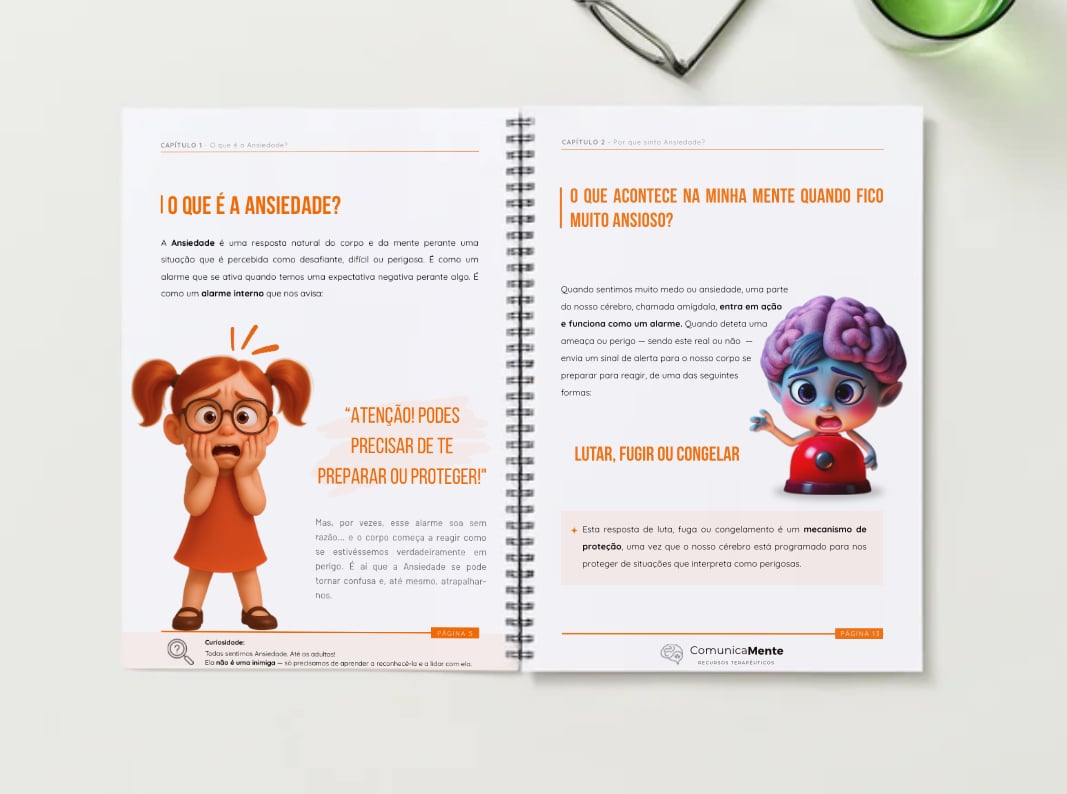 - 1 história psicoeducativa que ajuda a criança a compreender a ansiedade de forma simples e envolvente;