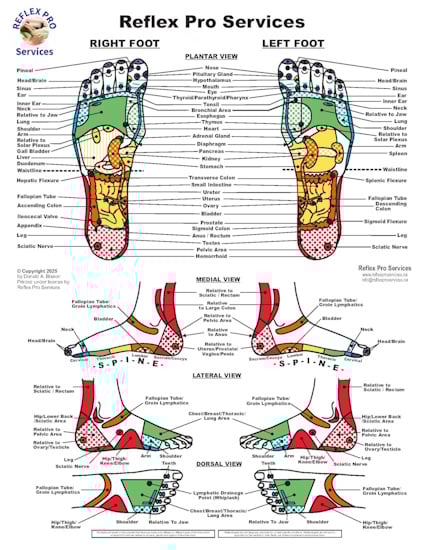 This Reflex Pro Foot and Hand charts are a professional-grade reflexology charts designed for reflexologists, massage therapists, holistic health practitioners, and wellness enthusiasts. The detailed plantar, dorsal, lateral, and medial views of the foot and hand provide clear reflex point locations, making it an essential tool for both practitioners and students.